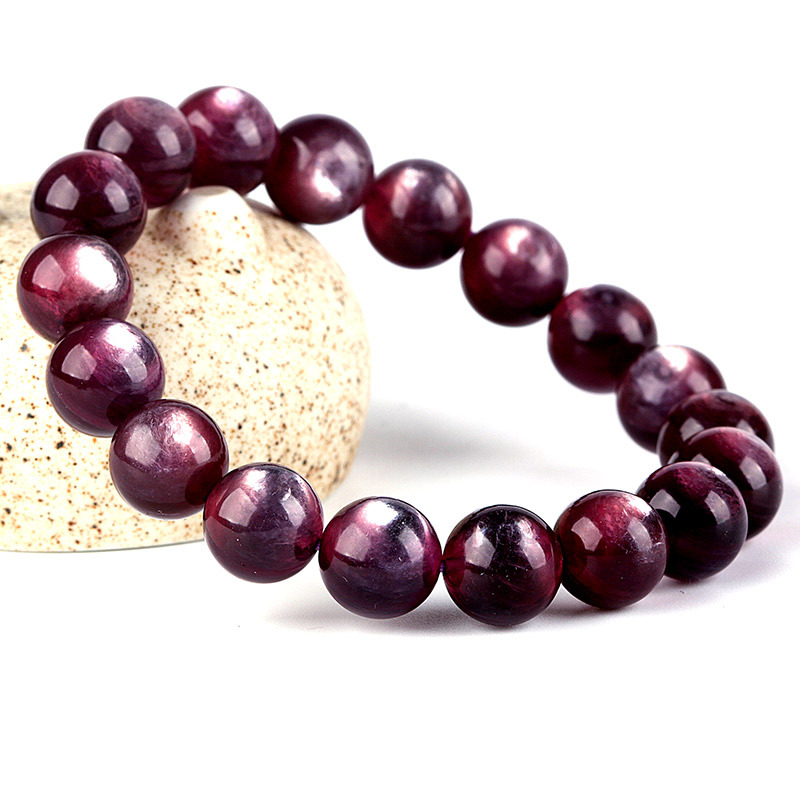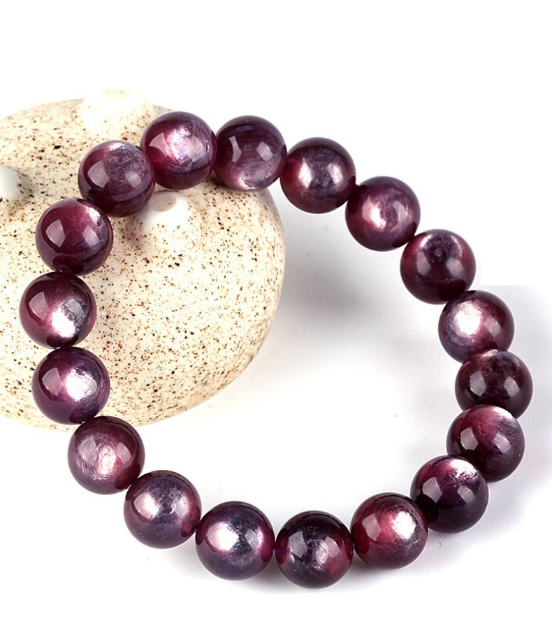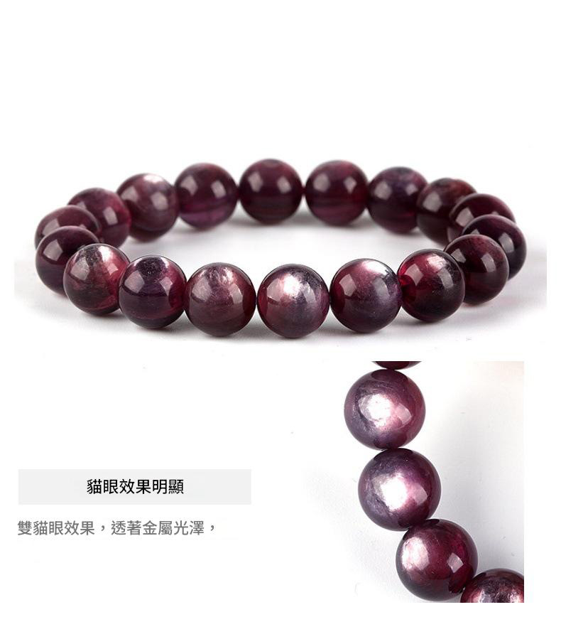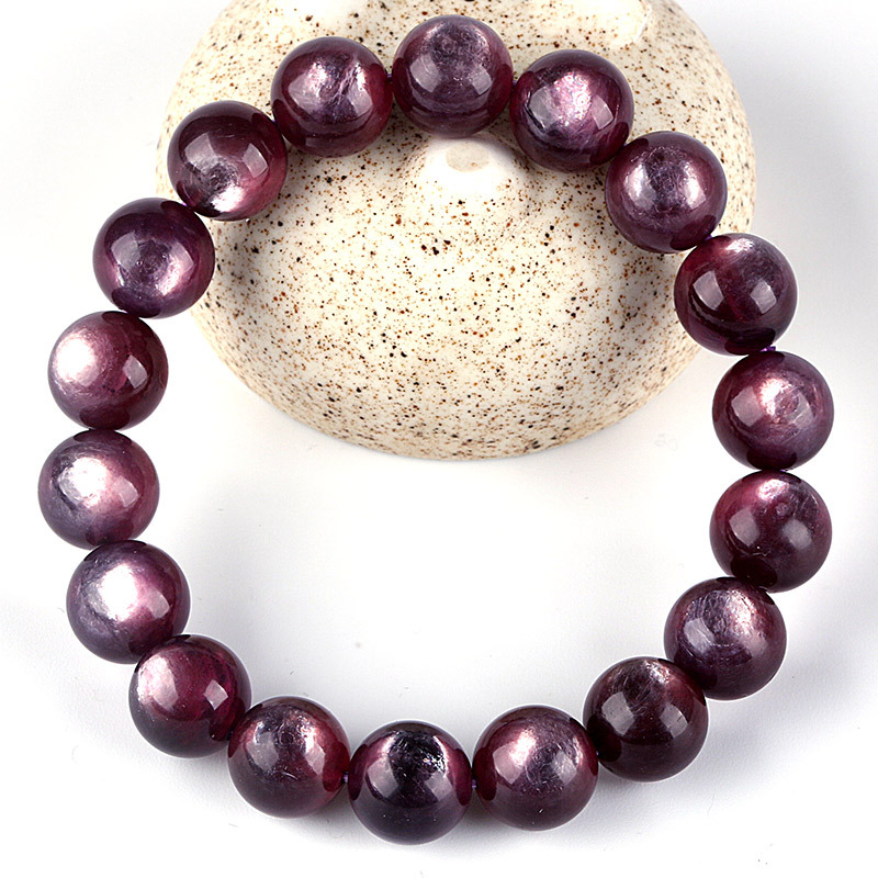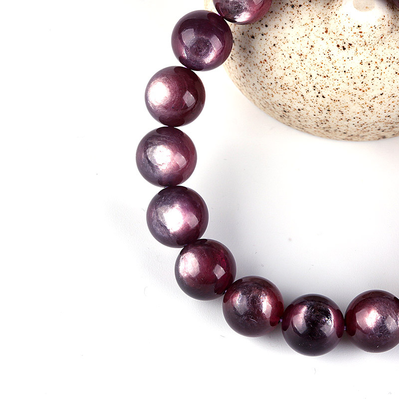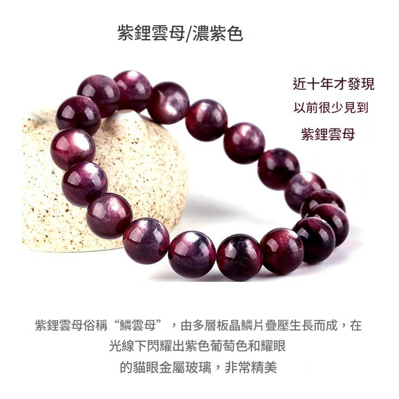 這款7A級天然紫鋰雲母手鏈呈現迷人紫葡萄色澤,珠徑10mm輕盈、12mm均衡、14mm厚實、16mm奢華,彈性紅線串繫,晶體鱗片狀結構在光線下閃耀金屬光澤,宛如魚鱗層疊,質地細膩優美。