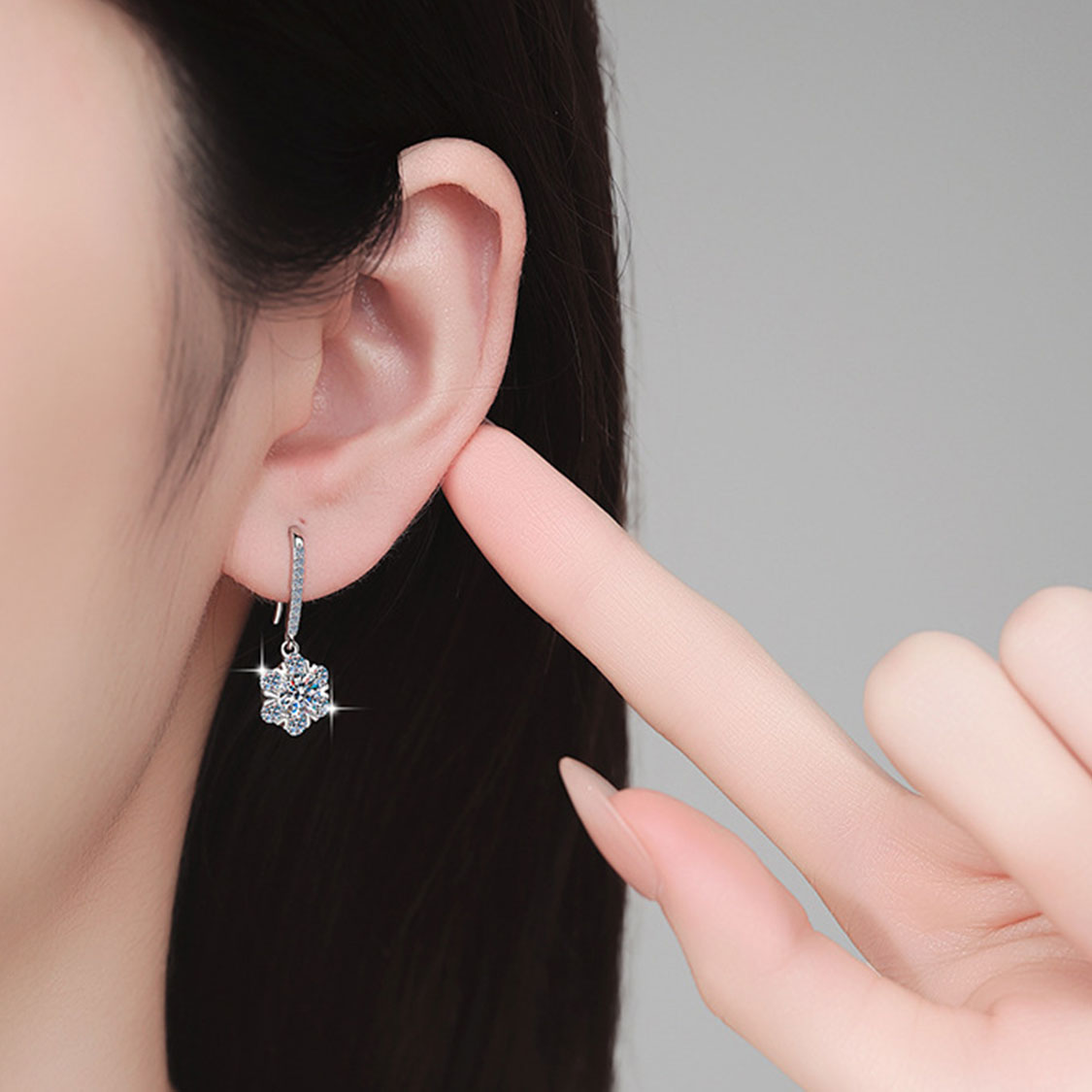 如同春日盛開的花朵在耳邊綻放,這款925純銀花卉莫桑石掛鉤耳環以精妙的八瓣花卉設計訴說著自然的優雅與生命力。中央一顆晶瑩剔透的莫桑石主石被八顆精選的克德石配飾環繞,形成完美的花瓣陣列,彷彿是一朵永不凋落的璀璨花朵,在光線下展現層次豐富的視覺效果。