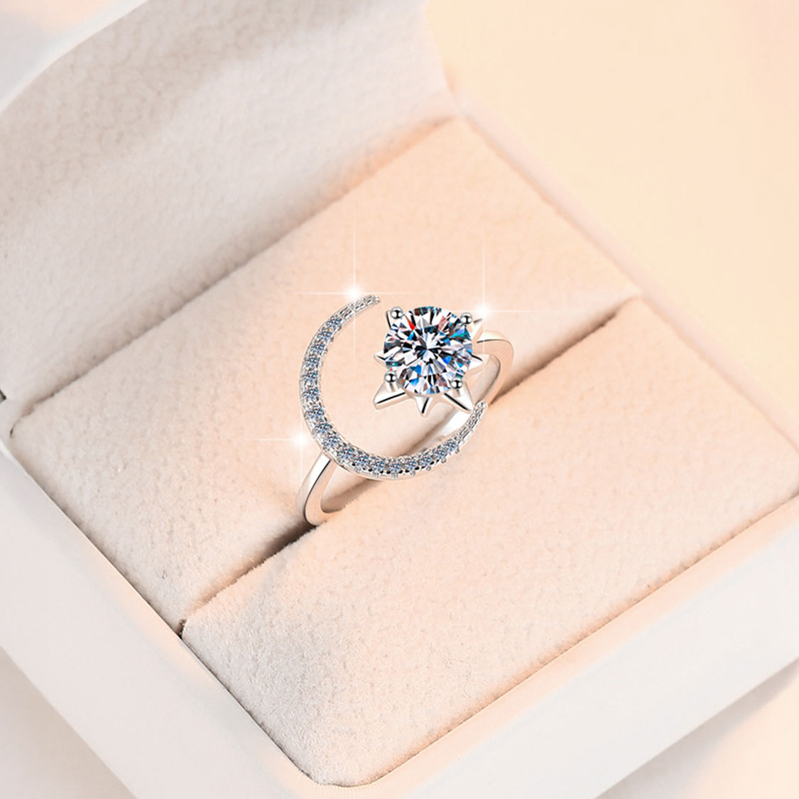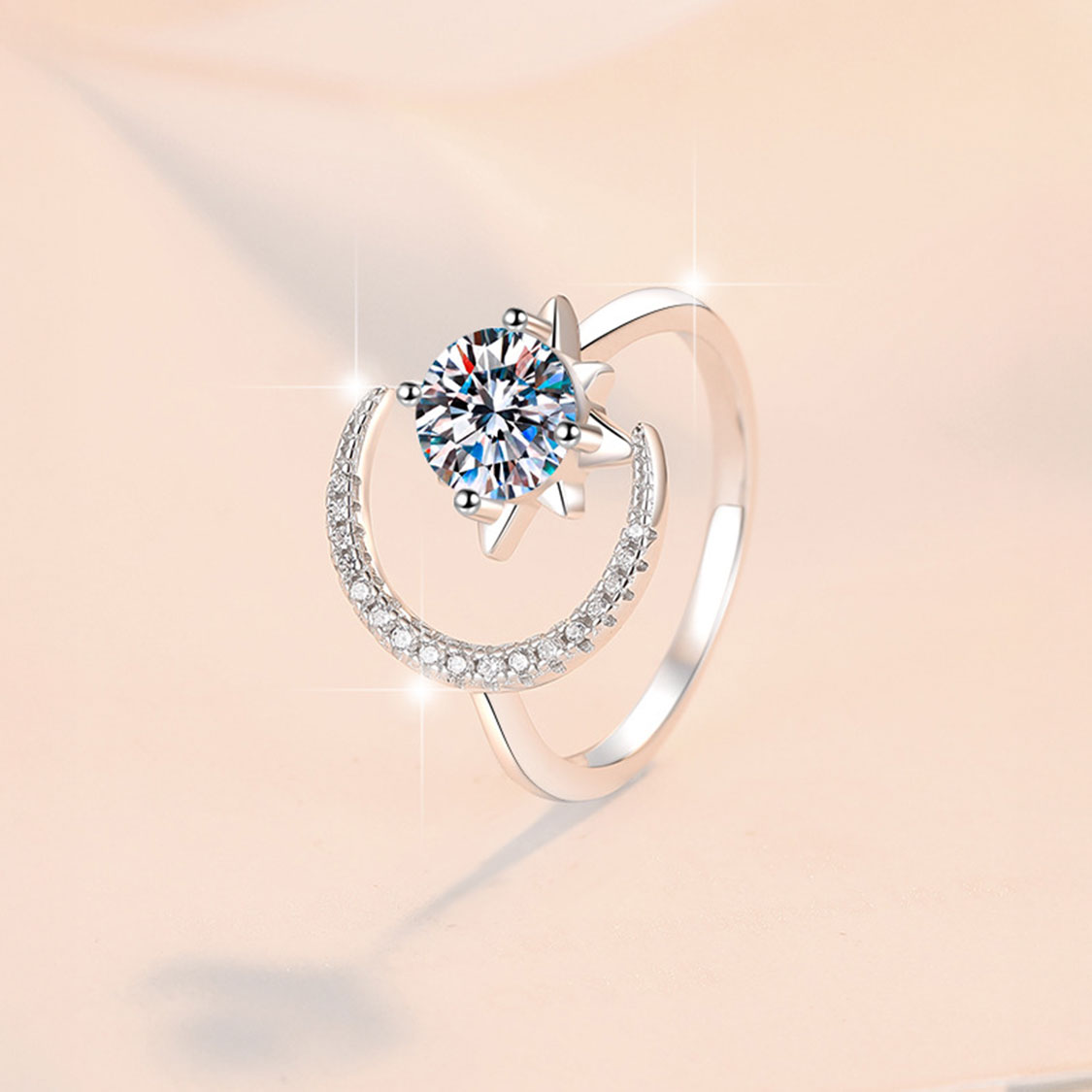 - 設計:開口款戒指,圓形框架 + 莫桑石頂部鑲嵌