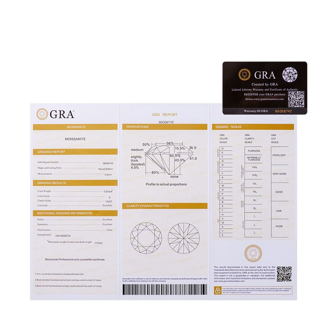 - 主石:莫桑石,0.5克拉或1克拉,多面切割,附GRA國際證書