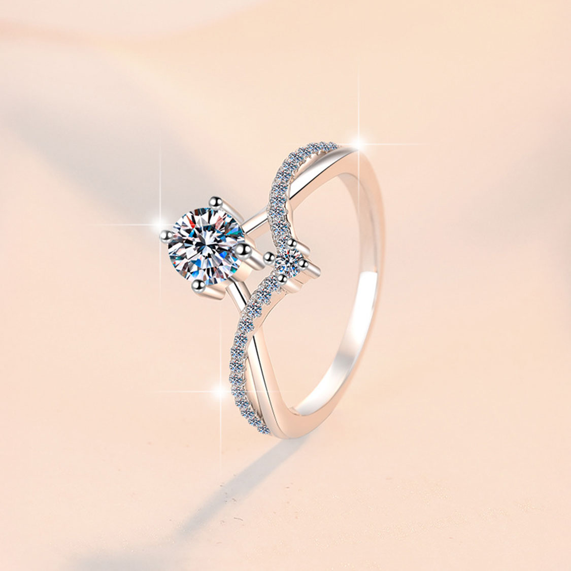 戒身設計層次豐富而不失洗練。925純銀的柔和質感搭配鍍鉑金外層,打造出高級的銀白色澤,既耐久又優雅。這款戒指最引人注目的設計是其雙層開放式框架—內層與外層並行展開,如同兩條優雅的緞帶在空間中交織。中心上方採用精心設計的四爪托座,優美而牢固地支撐著一顆光芒璀璨的莫桑石,成為整個設計的視覺焦點。雙層框架的內側與外側都沿著邊緣精心鑲嵌整排鋯石配飾,每一粒鋯石都經過精密切割,在陽光與燈光下閃爍著華麗的光彩。這種雙重設計不僅增添了視覺的豐富性與動感,更是展現了高級珠寶的精緻工藝與設計思想。