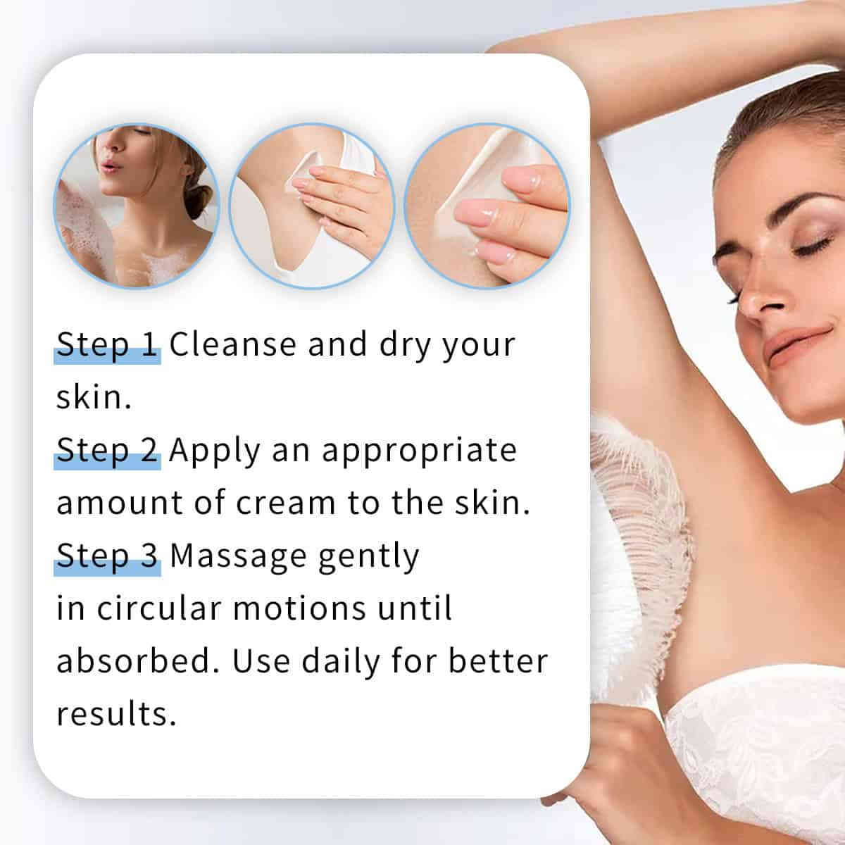 滋潤修護: 蘊含優質保濕因子,能深入滋潤腋下肌膚,改善因剃毛、刮毛引起的乾燥、粗糙感。