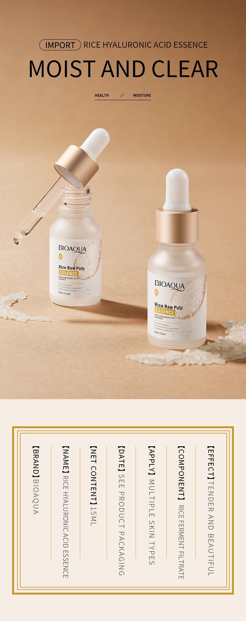BIOAQUA 米萃玻尿酸精華,蘊含米萃取、玻尿酸及多重植萃修護成分,質地輕盈滲透,能深層滋養、強化肌膚屏障,改善脆弱肌膚,重現水潤細緻光澤。