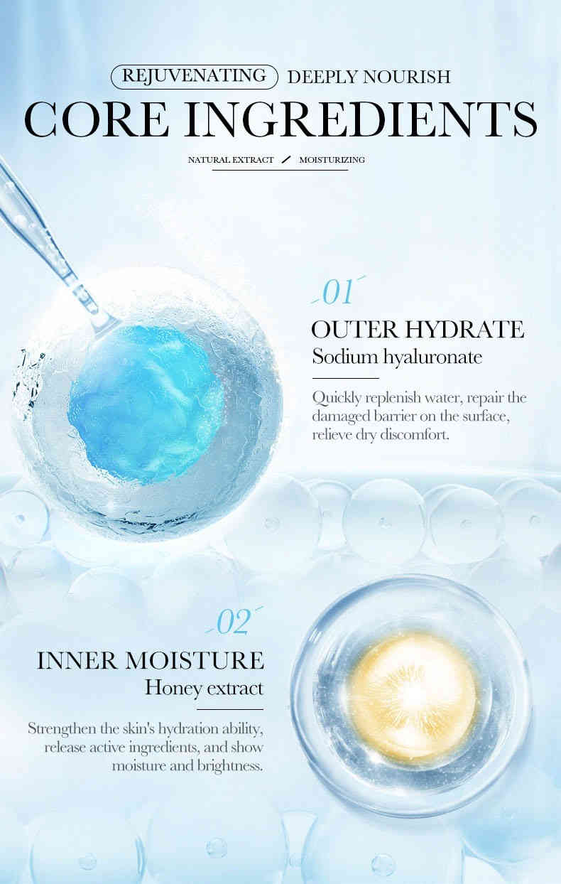 外補水:採用玻尿酸(透明質酸鈉),快速滲透肌底,即刻舒緩乾燥不適,修護受損屏障。