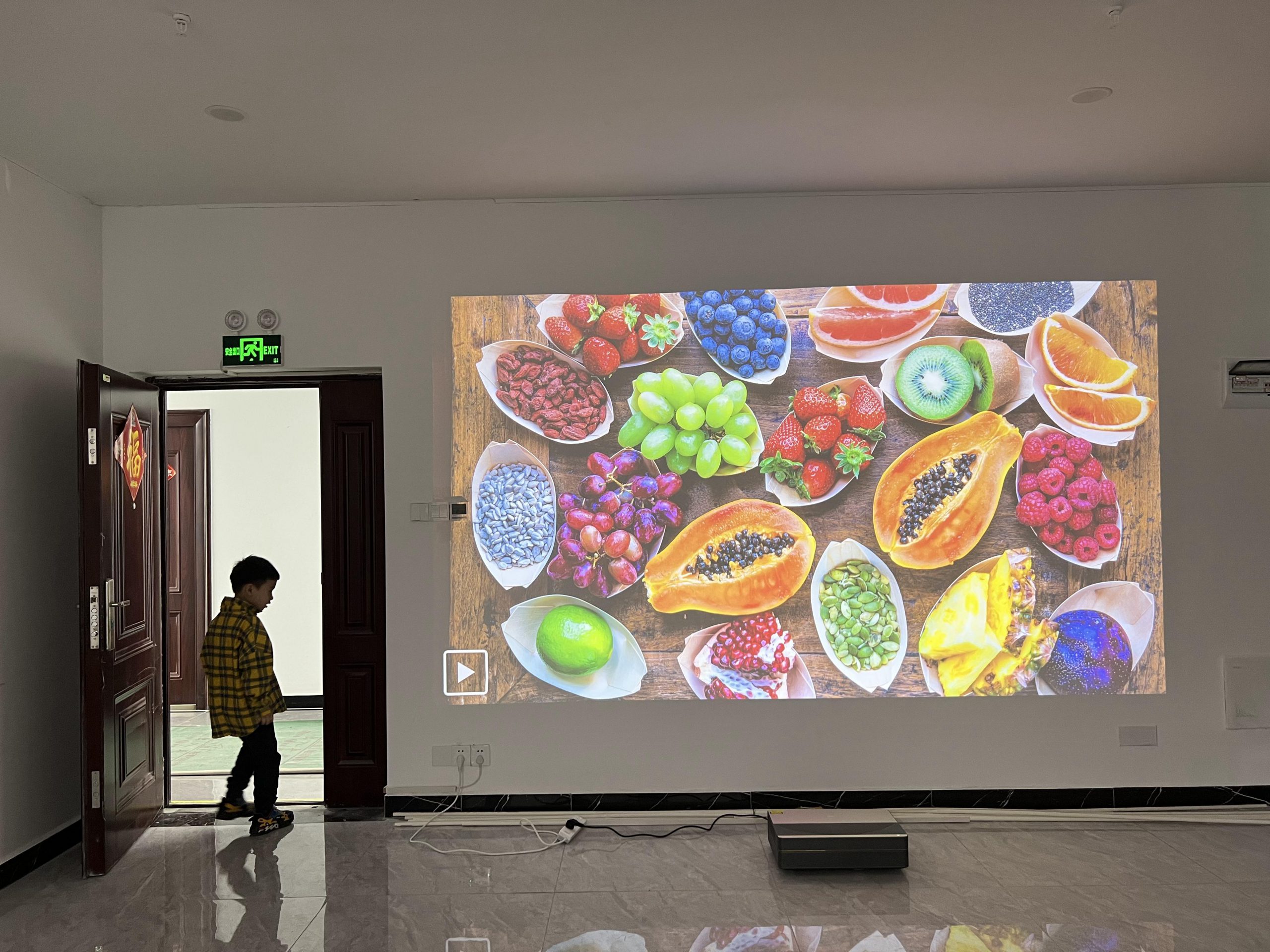 打開燈和門。投影尺寸為 130 英寸。用 iPhone 拍攝。沒有 PS。