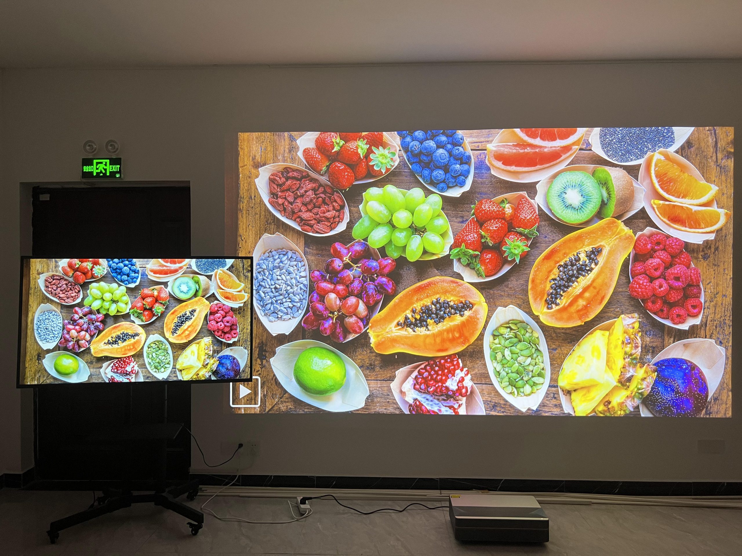 關掉燈和門。一天中完全黑暗的時間。投影尺寸為 130 英寸。用 iPhone 拍攝。沒有 PS。