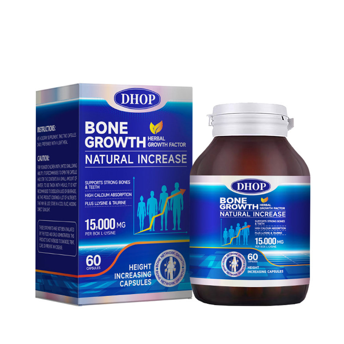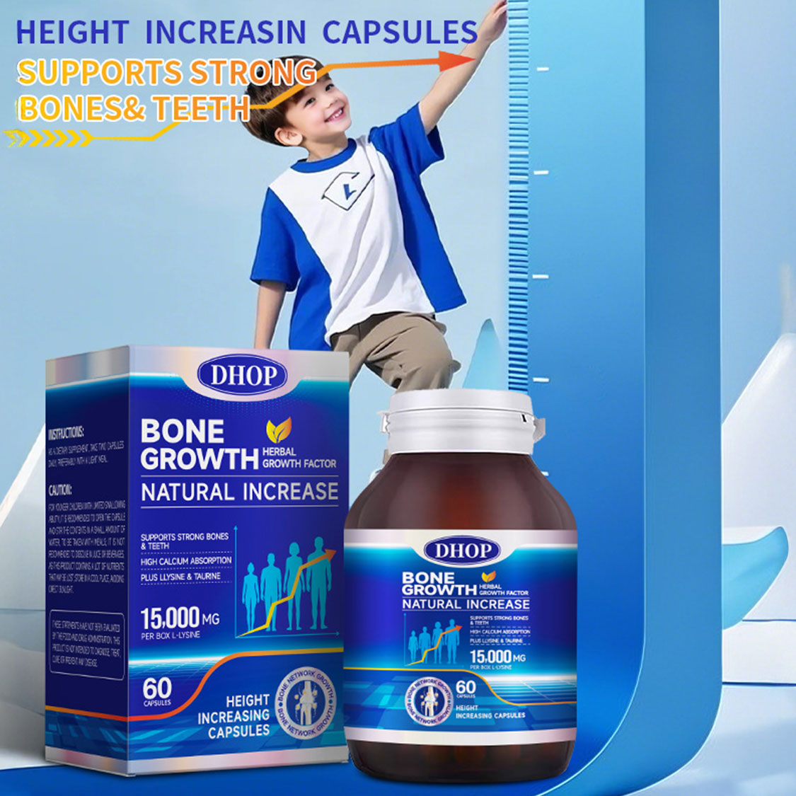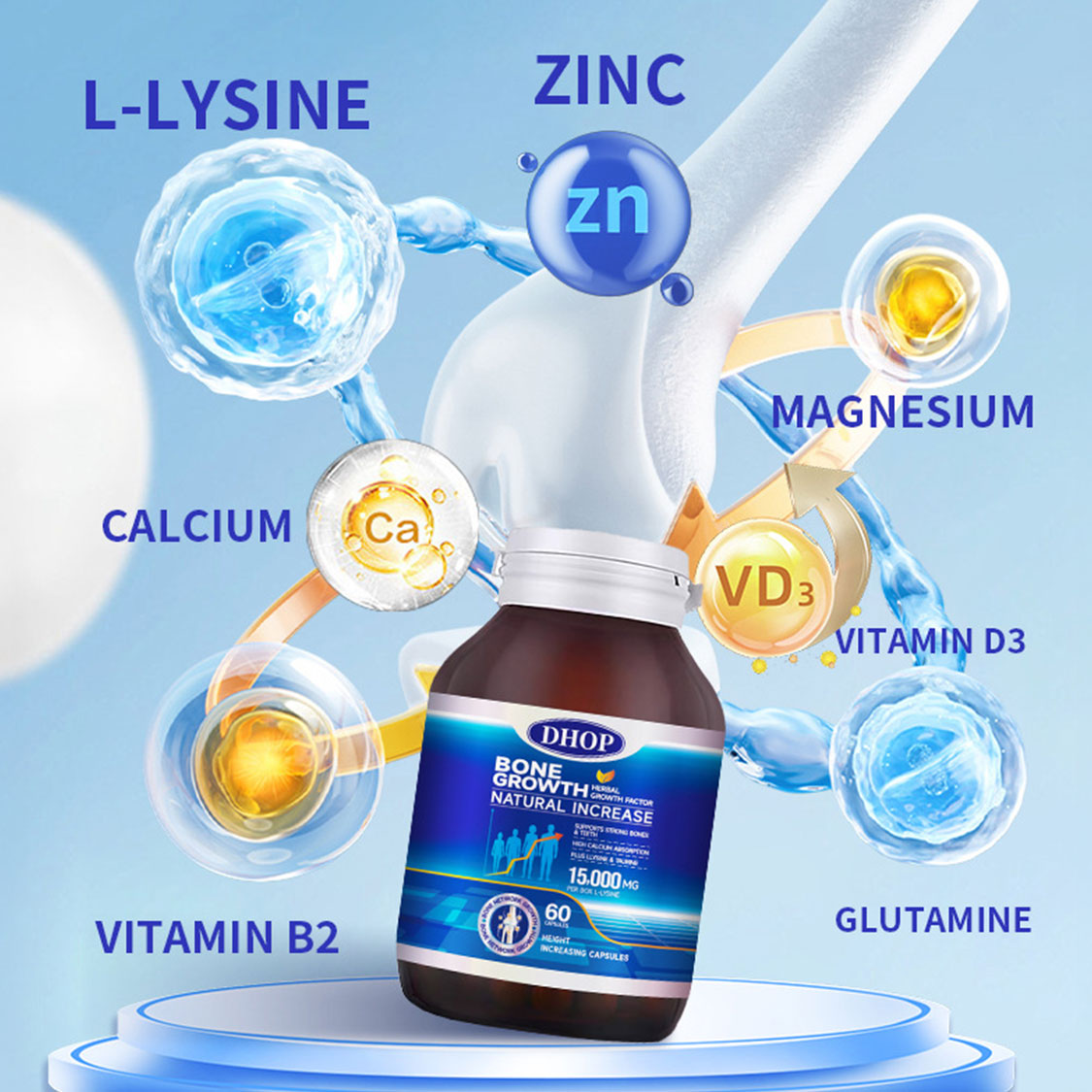 DHOP 天然增高膠囊採用科學配方,精選多種關鍵營養素,專為支持骨骼健康與生長發育而設計。每粒膠囊含有250毫克L-賴氨酸,能有效促進鈣質吸收;60微克維生素D3協助鈣質利用,強化骨骼密度;6毫克鋅元素支持細胞生長與分裂;20毫克鈣質直接補充骨骼所需礦物質。此外,配方還添加了穀氨酰胺、牛磺酸、精氨酸等氨基酸,以及橄欖葉提取物、大蒜提取物、骨肽粉末等天然成分,sn-甘油-3-磷酸膽鹼更有助於營養成分的吸收利用。
