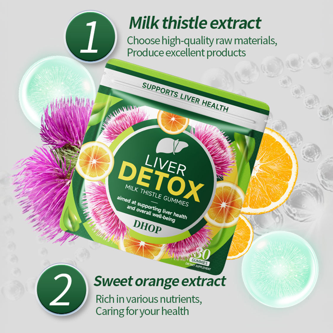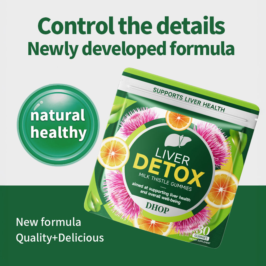 DHOP 奶蓟草護肝排毒軟糖採用全新科學配方,精選多種天然植物萃取精華,專為支持肝臟健康與全身排毒而設計。核心成分奶蓟草提取物富含水飛薊素,能有效保護肝細胞、促進肝臟解毒功能;搭配蒲公英根萃取、薑黃萃取與桑黃菇萃取,協同作用增強肝臟排毒效率,減輕身體負擔。特別添加穀胱甘肽、N-乙酰半胱氨酸與輔酶Q10,提供強大抗氧化保護,中和自由基,維持肝細胞健康。