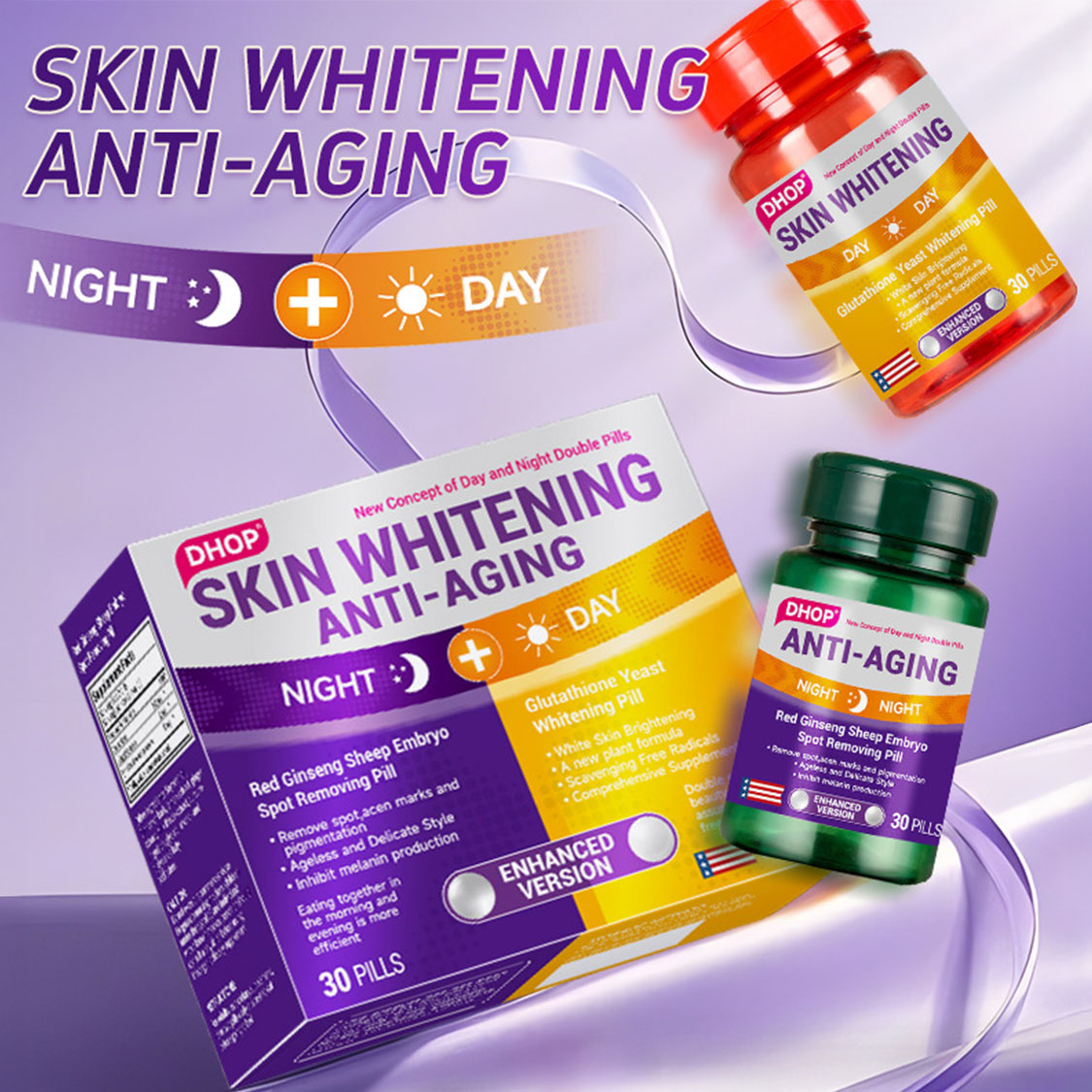 DHOP 日夜雙效美容組合,採用全新植物配方,為您帶來日夜不間斷的美肌修護。日間使用「穀胱甘肽酵母美白丸」,精選多種美容成分,如膠原蛋白肽、煙醯胺與玫瑰萃取物,能有效提亮膚色、掃除自由基,為肌膚進行全面的日間防護與營養補充。夜間使用「紅參羊胚胎淡斑丸」,核心成分包含穀胱甘肽、L-麥角硫因與吡咯喹啉醌,深入肌底抑制黑色素生成,精準針對色斑、痘印及色素沉澱,在夜間修護的黃金時期強化淡斑與抗衰老效果。