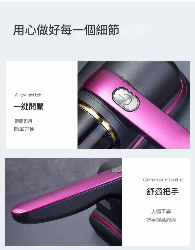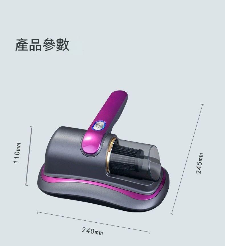 工作原理:紫外綫,強震拍打,熱風 産品功率:70W 凈重:1kg(含)—2kg(不含) 綫長:無綫 最大噪音:50dB 濾網類型:HEPA(海帕),過濾棉 機身尺寸:245X240X110mm 操作方式:按鍵式 產品顏色:紫色、金色