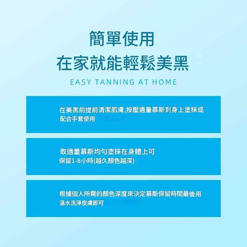 美黑慕斯:綿密泡沫輕盈不黏膩,快速吸收,打造薄透均勻的霧面效果。