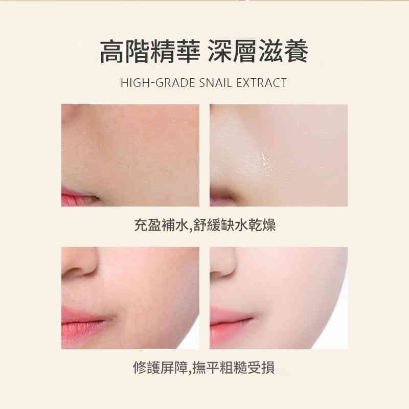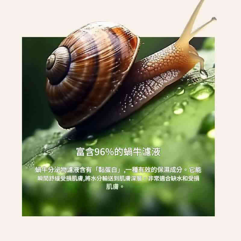 • 核心添加96%高濃度蝸牛濾液精華,蘊含豐富的黏多醣、尿囊素及甘醇酸,能深層修護受損肌膚,強化肌膚屏障功能。