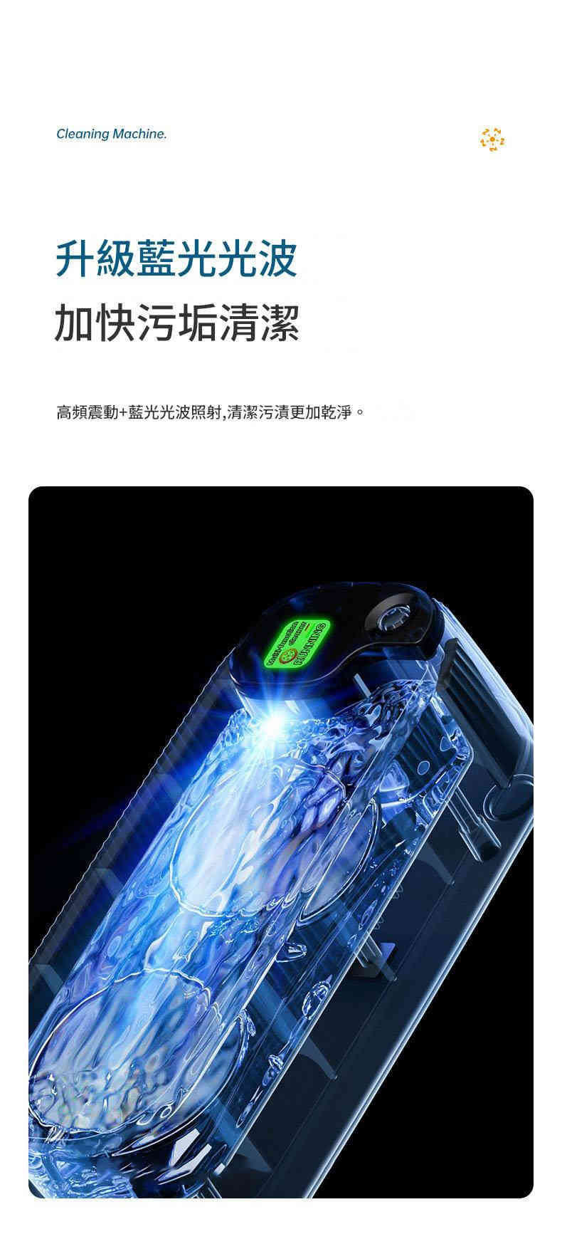 全新加入升級藍光光波,配合高頻震動,雙效合一,能更快分解頑固污漬,殺菌淨味,讓清潔效果更徹底、更安心。