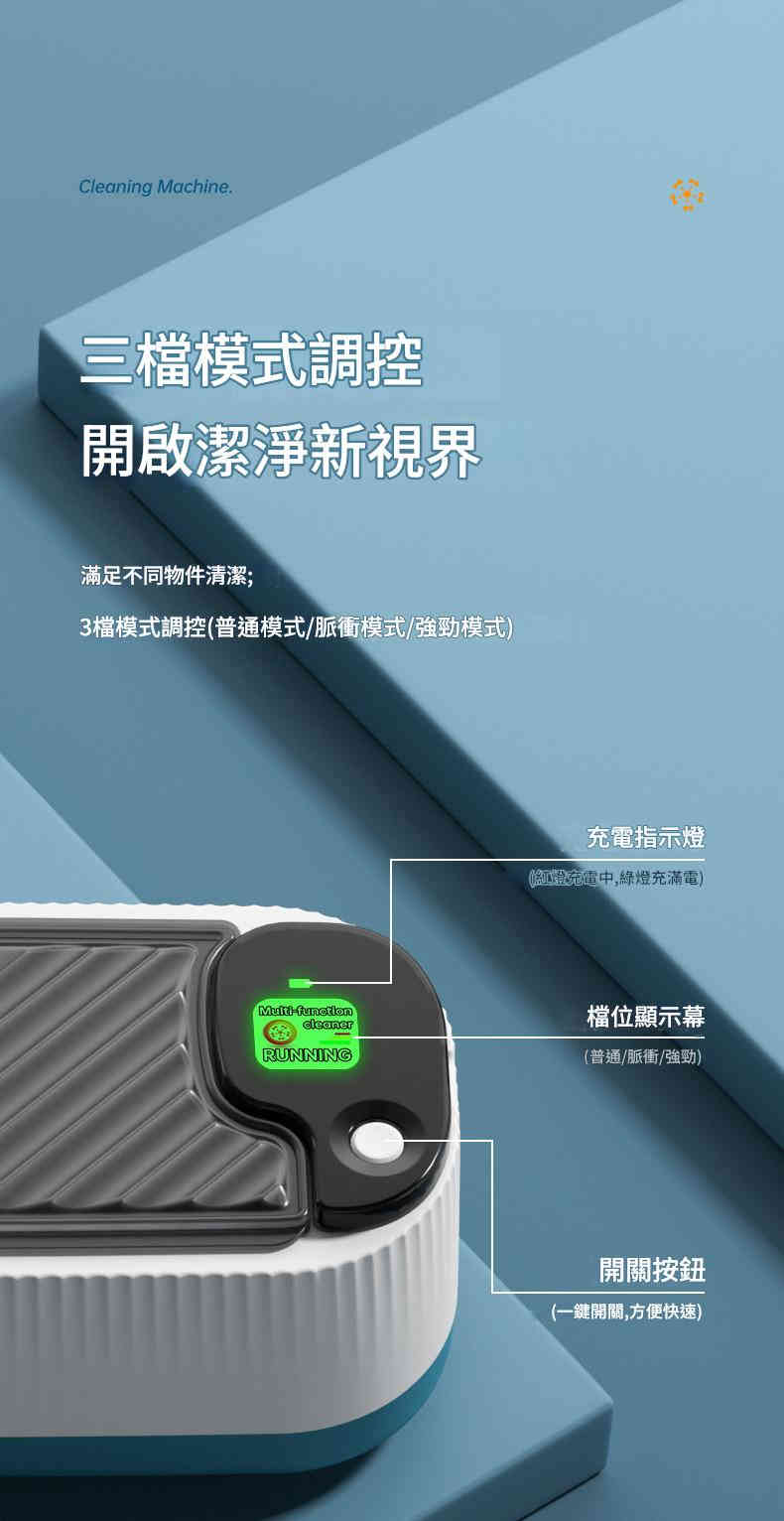 內建三檔清潔模式(普通/脈衝/強勁),可根據不同物件與污漬程度自由選擇,溫柔呵護眼鏡鏡片,也能強力清潔首飾、化妝刷等日常用品。