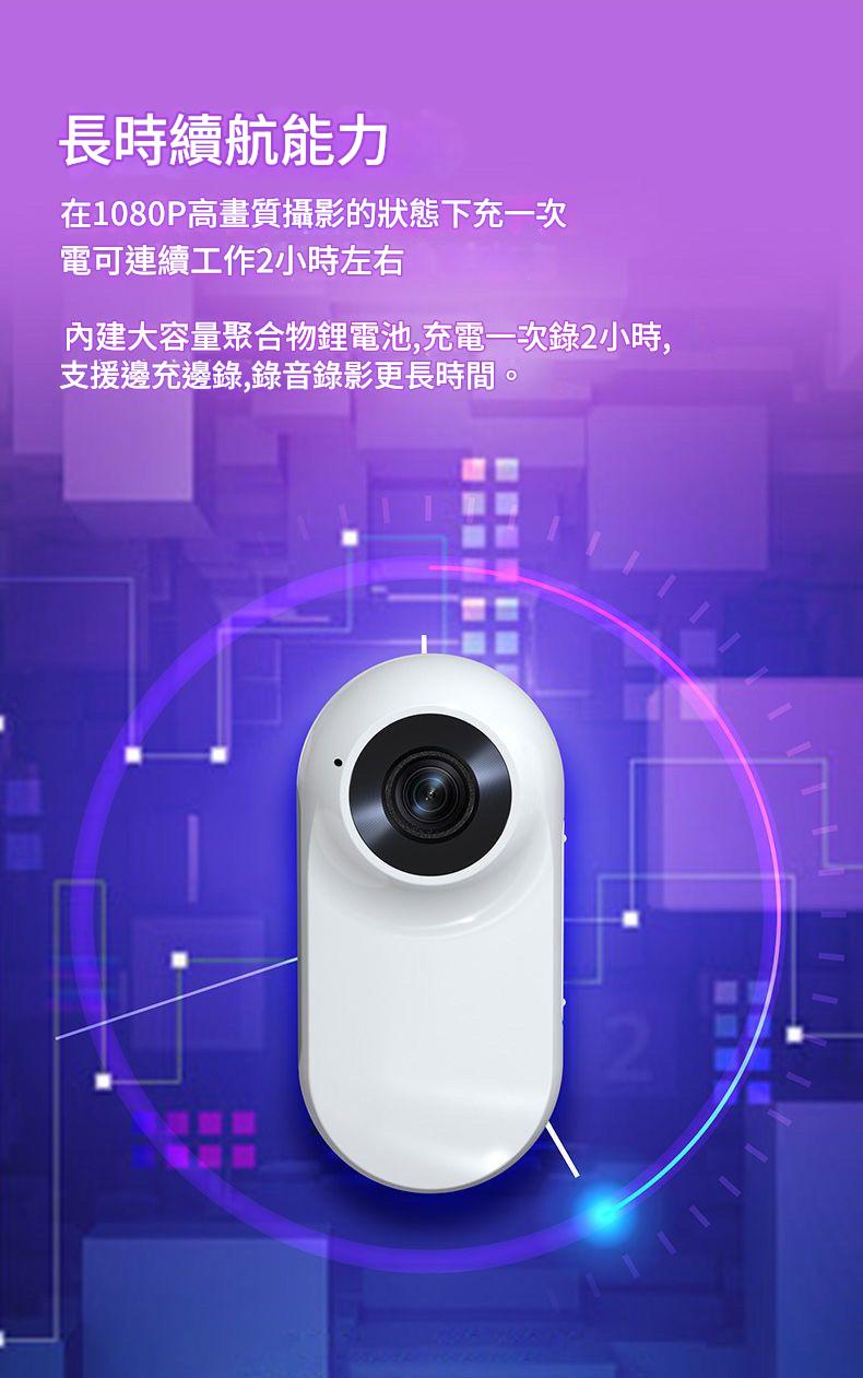 內建 380mAh 大容量電池:1080P 模式下連續錄影約 2 小時,滿足長時間使用需求。