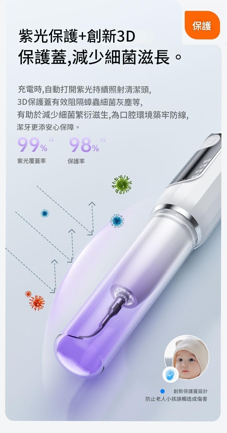 充電時自動開啟紫外光殺菌,搭配防護蓋阻隔灰塵、細菌,衛生更有保障。