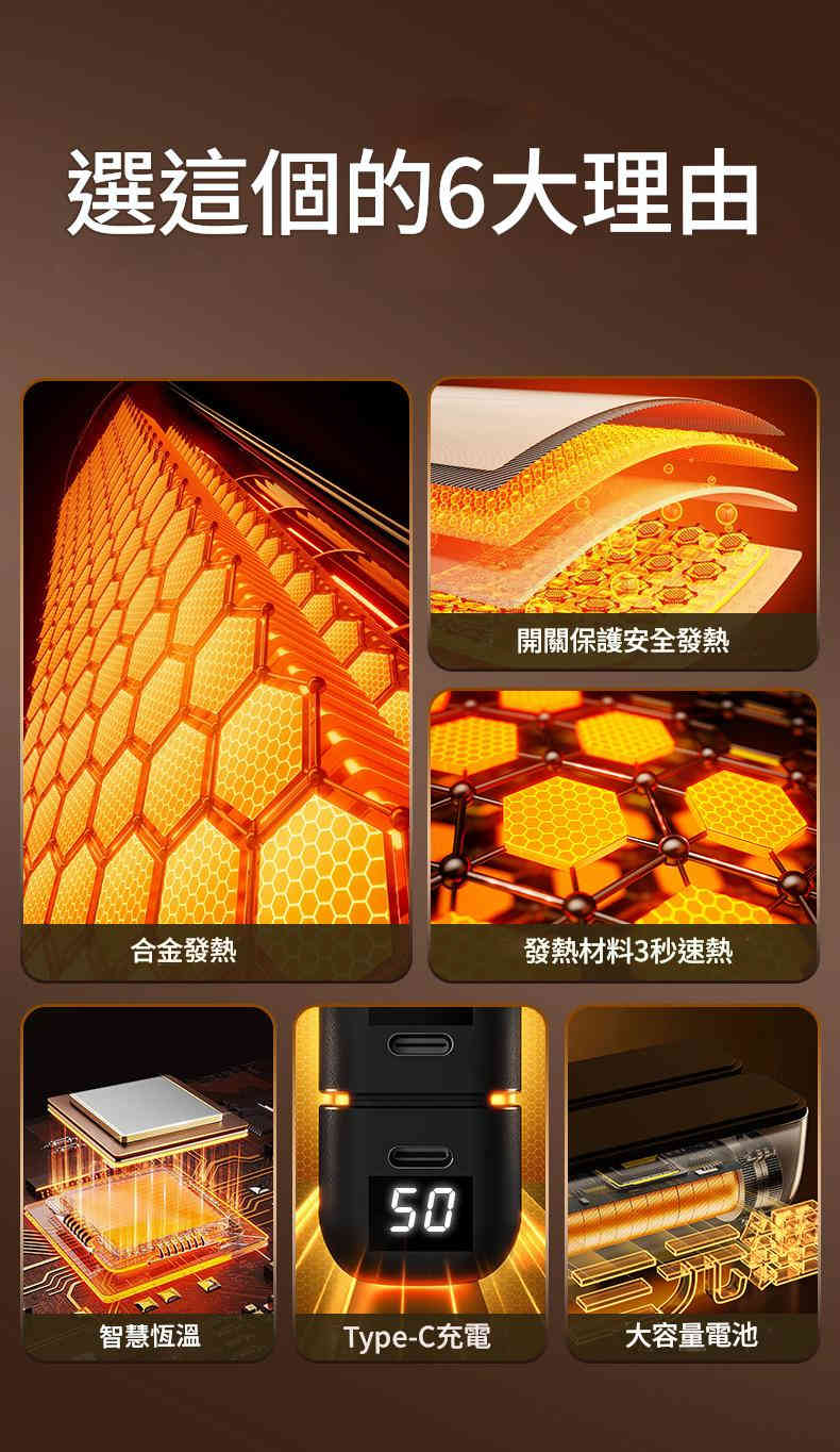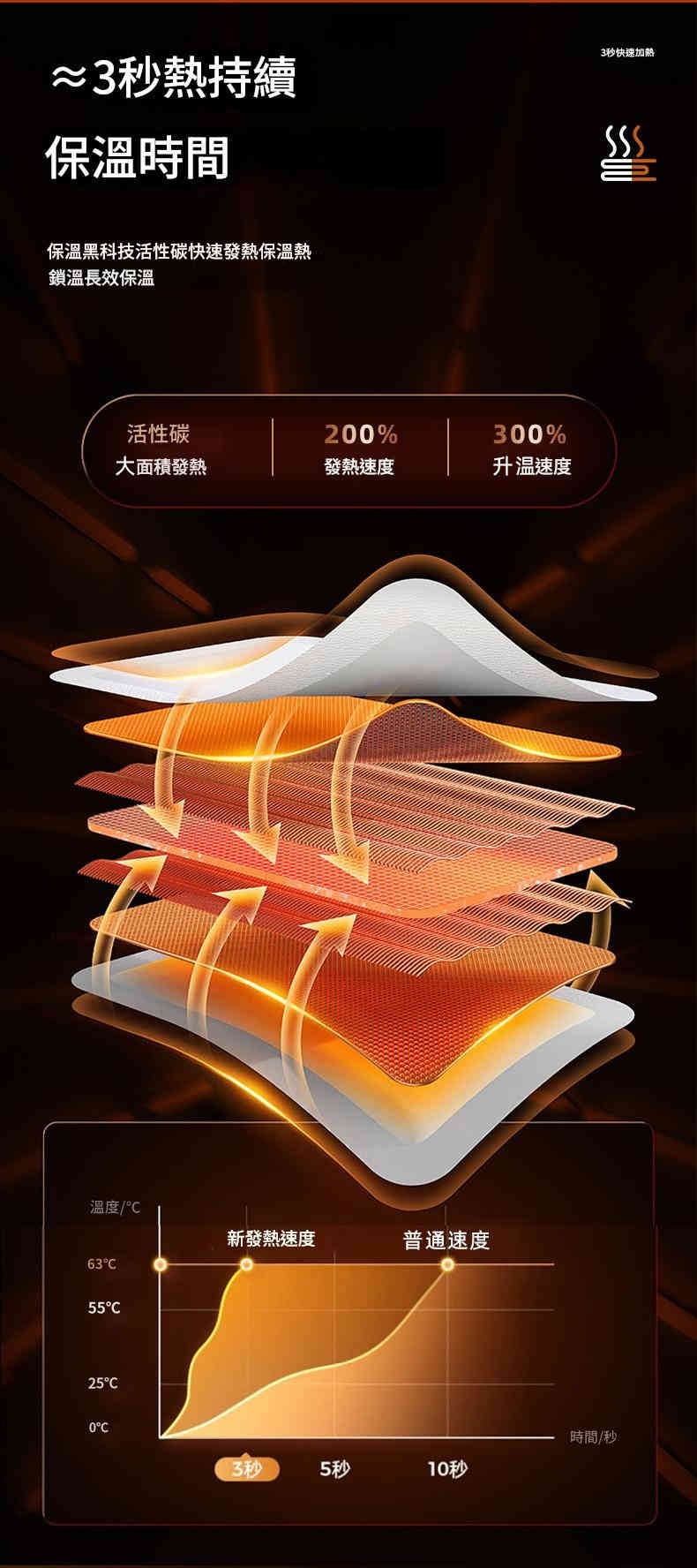 3秒極速發熱:採用活性炭合金發熱片,啟動即暖,快速升溫高達300%,寒意瞬間退散。