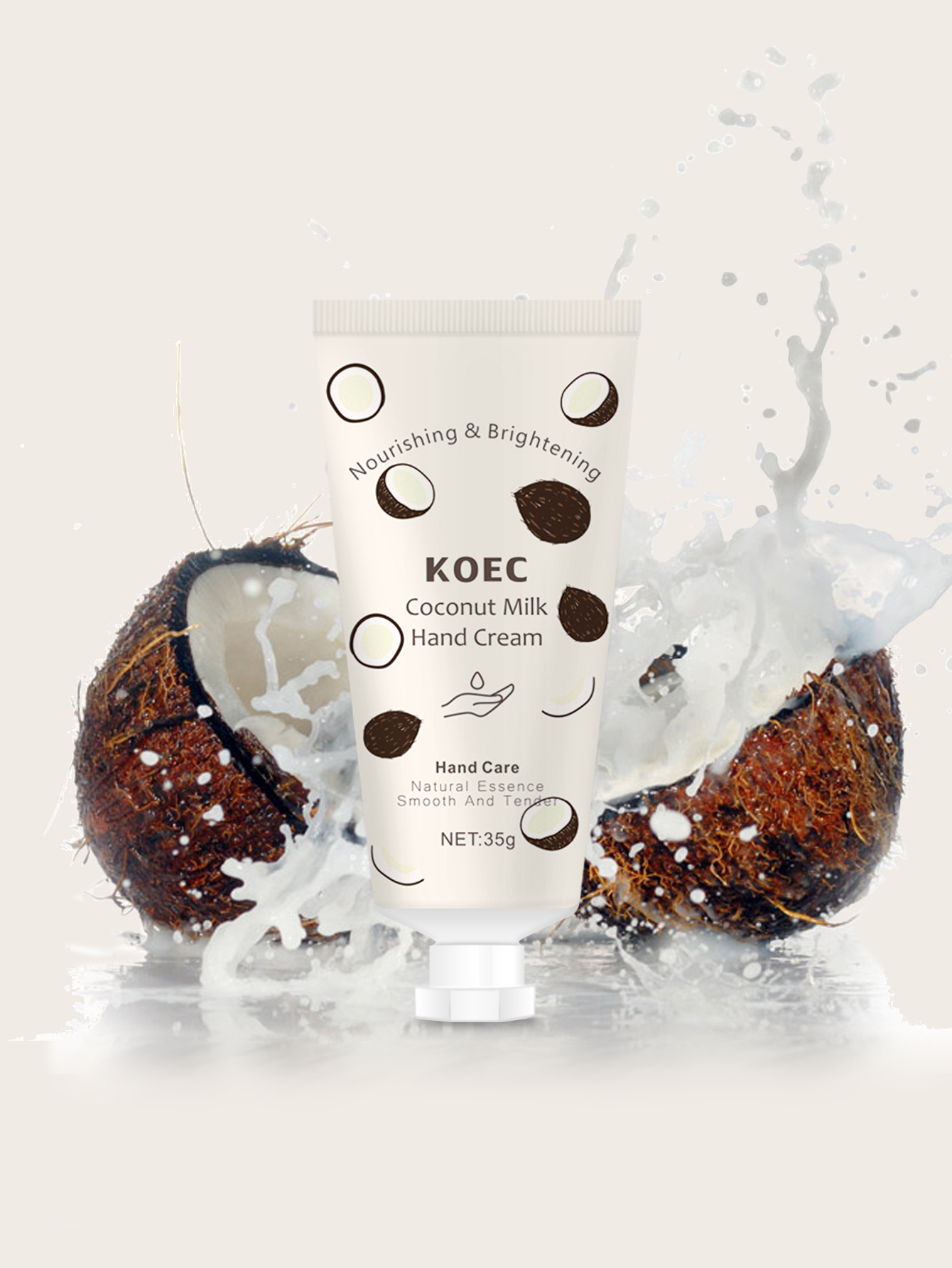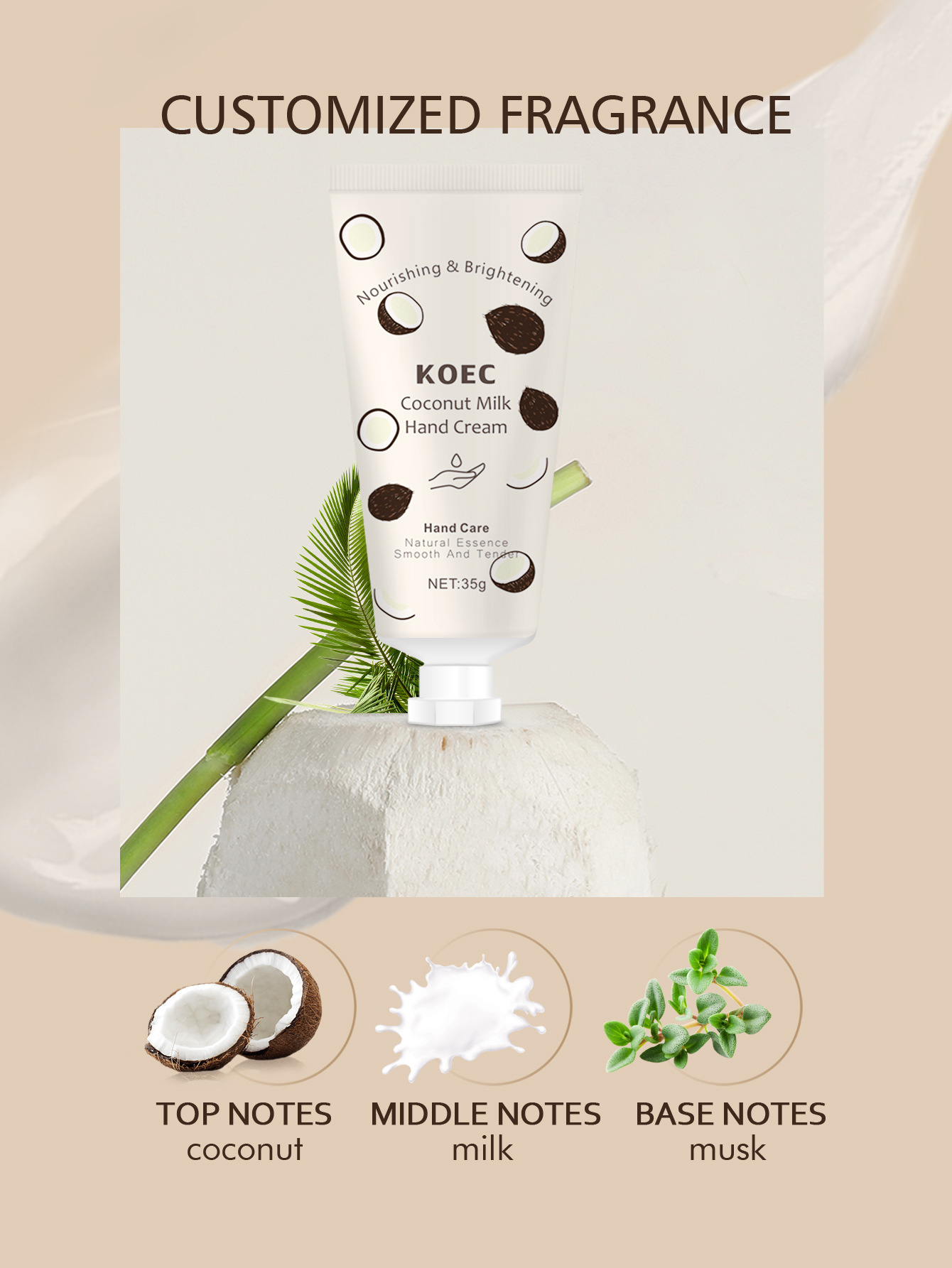 KOEC 椰奶護手霜,以清新椰子、溫暖奶香與柔和麝香,調配出專屬的療癒香氣,每一次使用都是一場感官的放鬆旅程,讓雙手沉浸於溫柔的香氛呵護中。