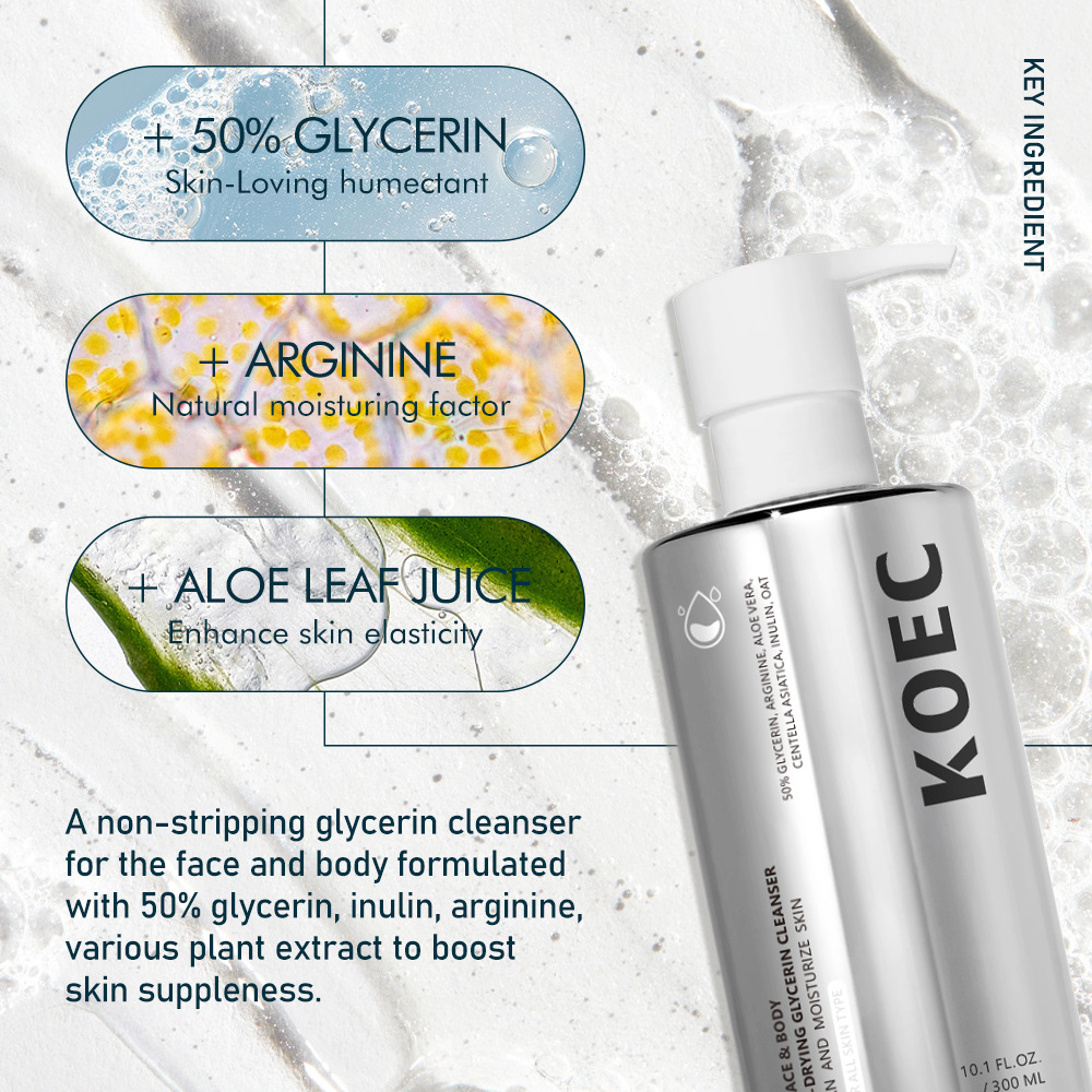 KOEC 非乾澀甘油潔膚露,以高達50%的甘油為核心成分,溫和清潔的同時形成保護膜,防止表面活性劑破壞肌膚屏障,洗後不乾澀、不緊繃,讓肌膚保持水潤柔軟。