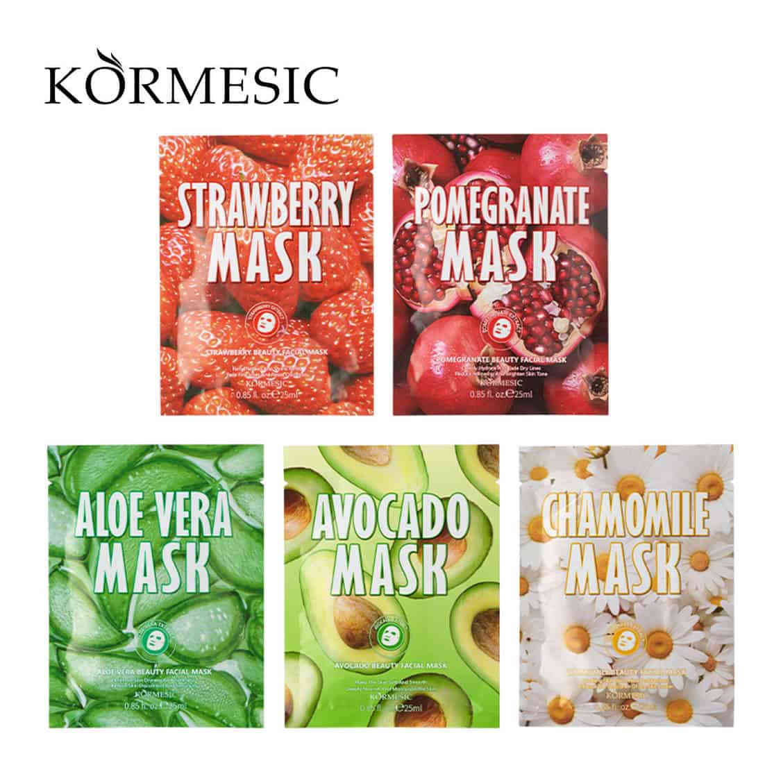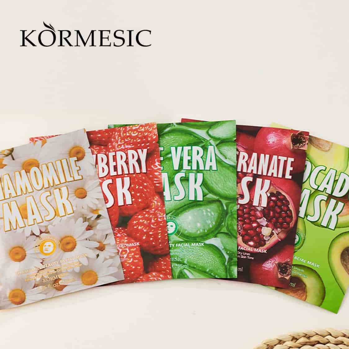KORMESIC 天然植物面膜系列精選五種天然植物萃取,針對不同肌膚問題提供專業護理。每片面膜蘊含25g豐富精華液,採用保濕薄膜布,溫和親膚易吸收。