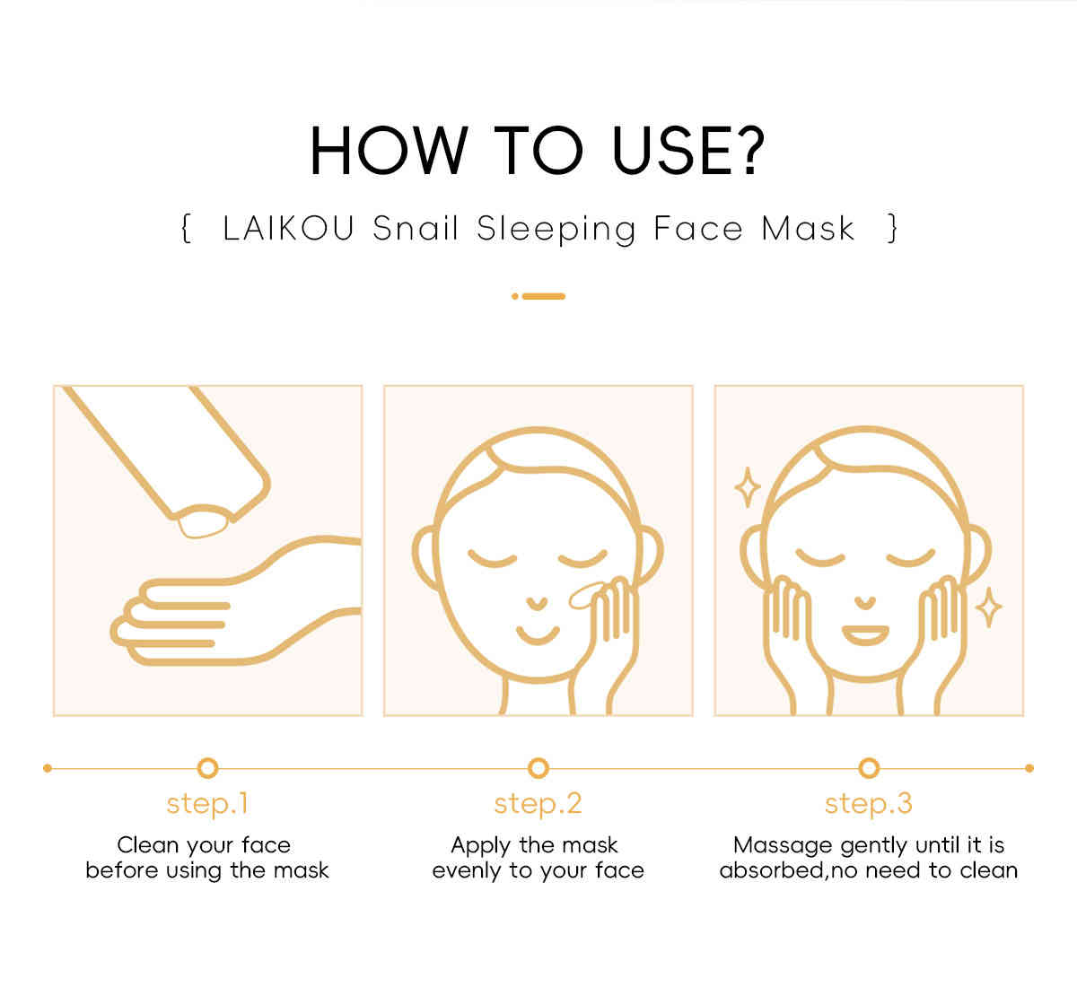 清潔臉部後,均勻塗抹面膜,輕輕按摩至吸收即可入睡,隔天肌膚水嫩光滑!
