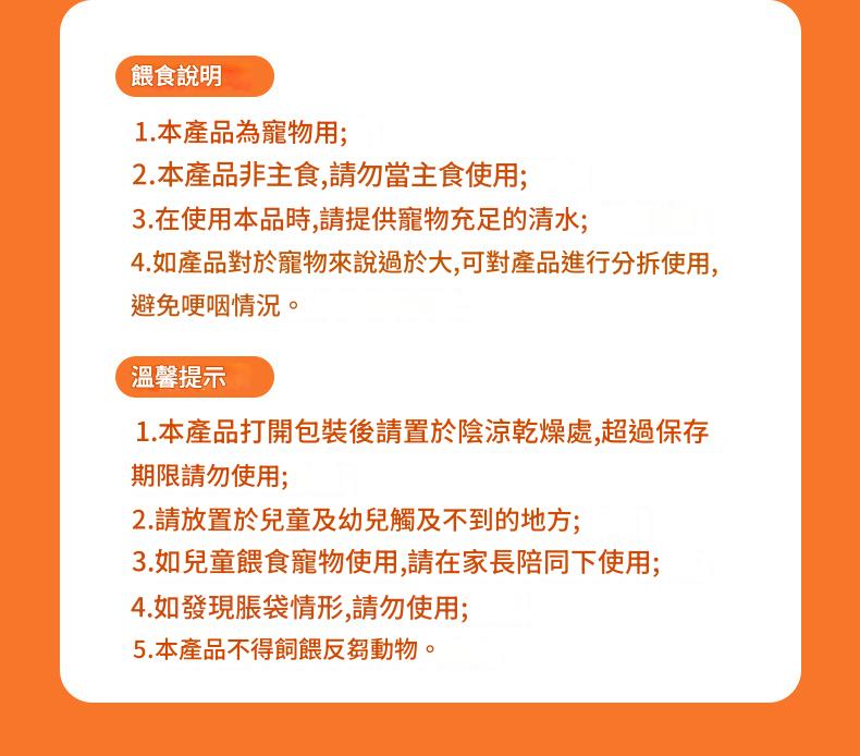 本品為零食,請勿替代主食。餵食時請提供充足飲水,建議分次給予,避免寵物噎到。