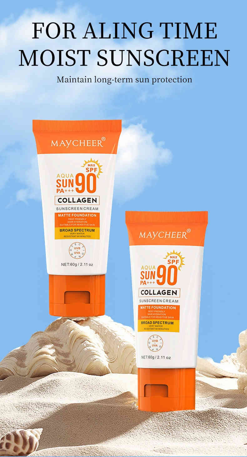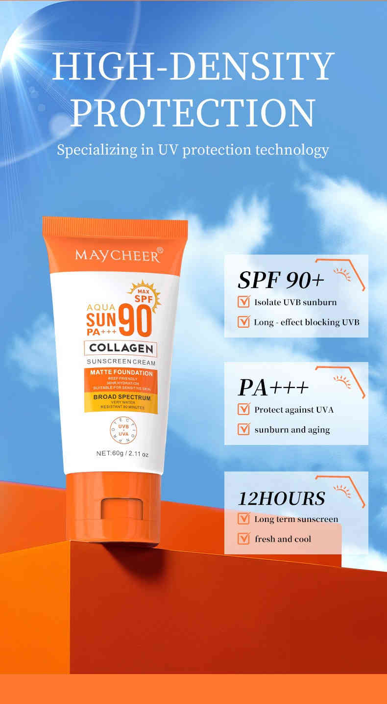 面對無處不在的紫外線,你需要的不只是防曬,更是高密度、長效且清爽的保護!MAYCHEER 膠原蛋白防曬霜,SPF90+ 與 PA+++ 超高係數,專為夏季與日常全方位防曬需求設計,讓你在戶外活動、旅行、運動時都能安心享受陽光。