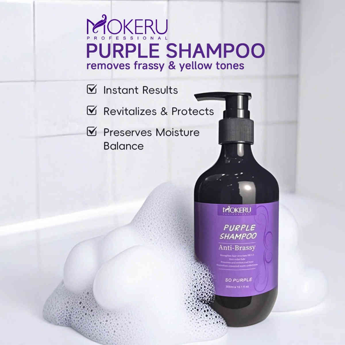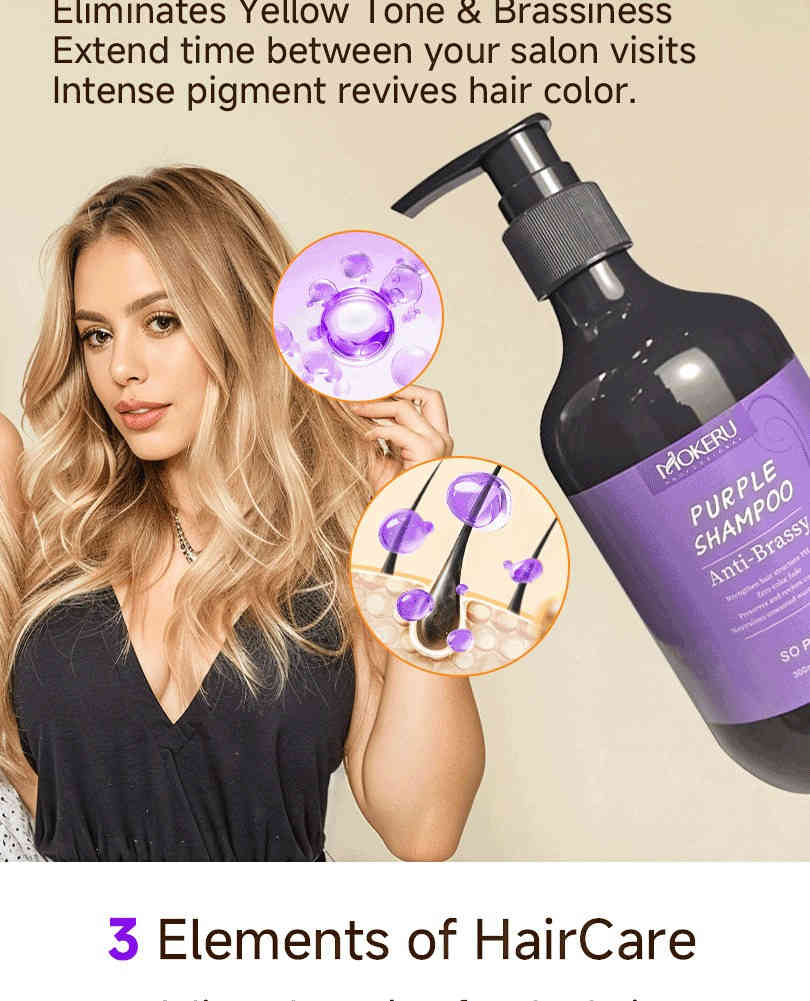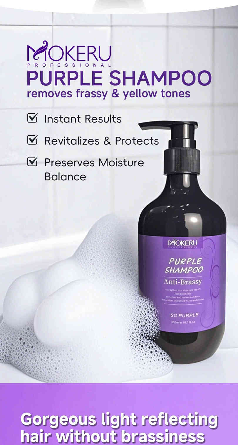不同於一般洗髮水越洗越乾黃,MOKERU 紫色洗髮水以低刺激配方,溫柔清潔頭皮,並在每次洗髮中逐步校正色調,重現髮絲光澤感。