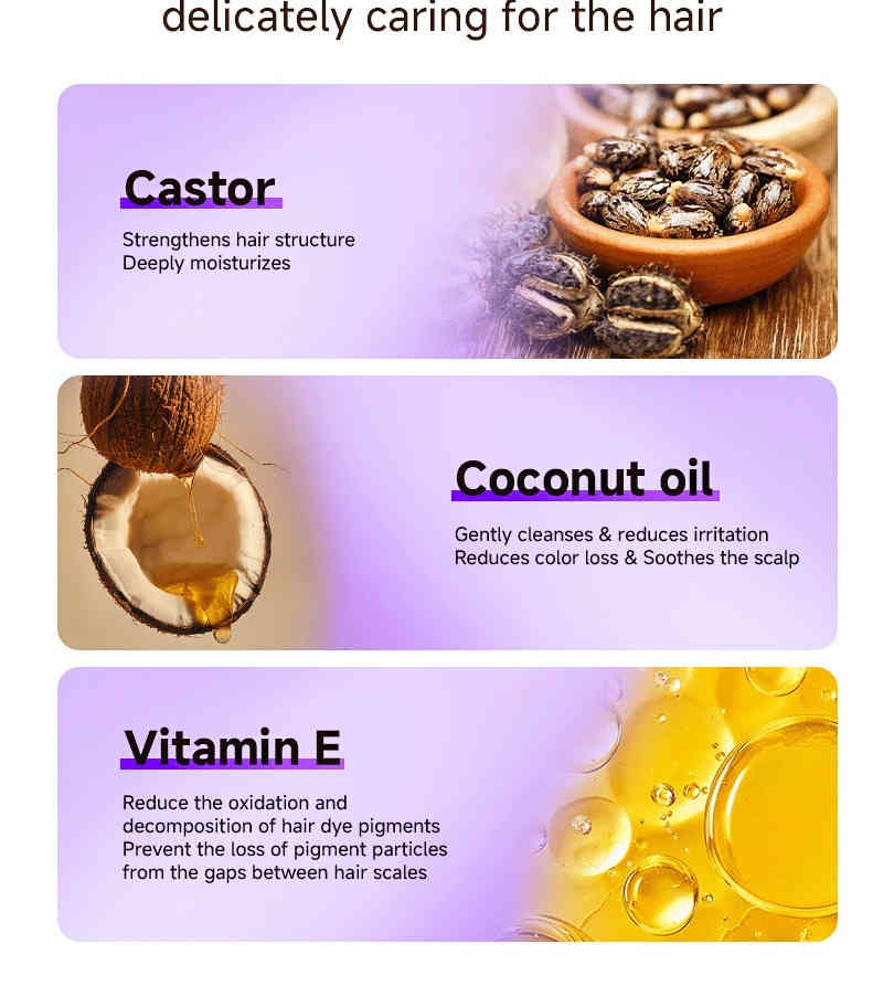 ▸ 染後護理二合一:溫和清潔同時保濕修護,添加蓖麻油、椰子油與維他命E,強化髮絲結構、減緩色素氧化流失,洗後柔順不乾澀。