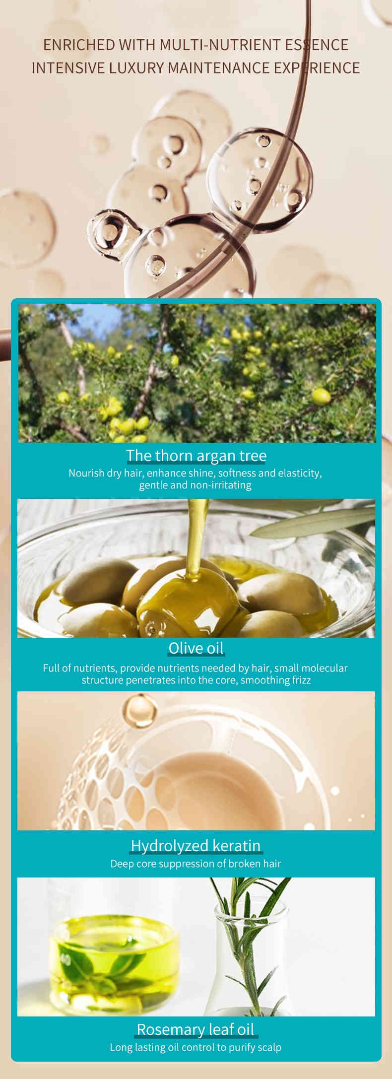 添加摩洛哥堅果油、角鯊烷、荷荷芭籽油、迷迭香葉油等天然植萃,專為改善毛躁、打結、脆弱斷髮問題,滋養同時修護受損髮質。