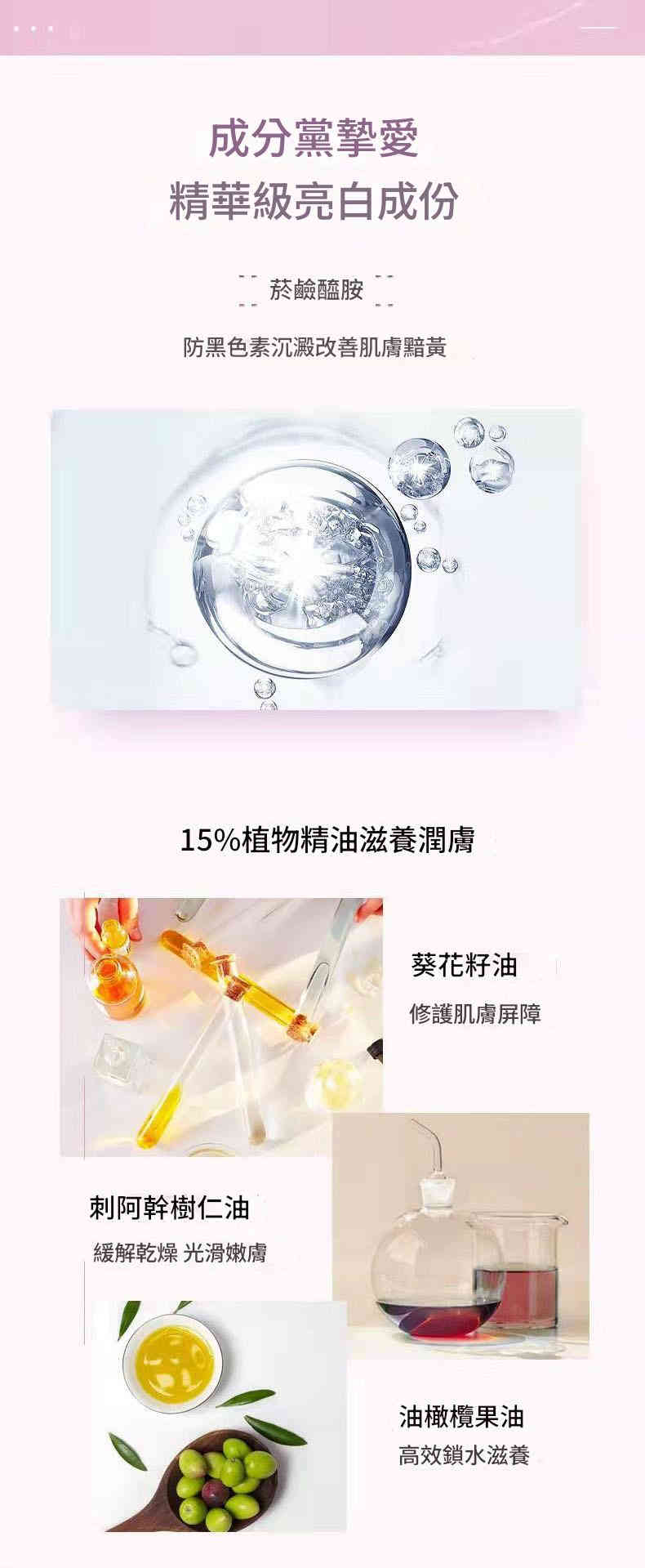 煙酰胺 + 果酸 + VC:有效提亮暗沉、改善「雞皮膚」與背後痘痘,讓肌膚柔嫩透亮