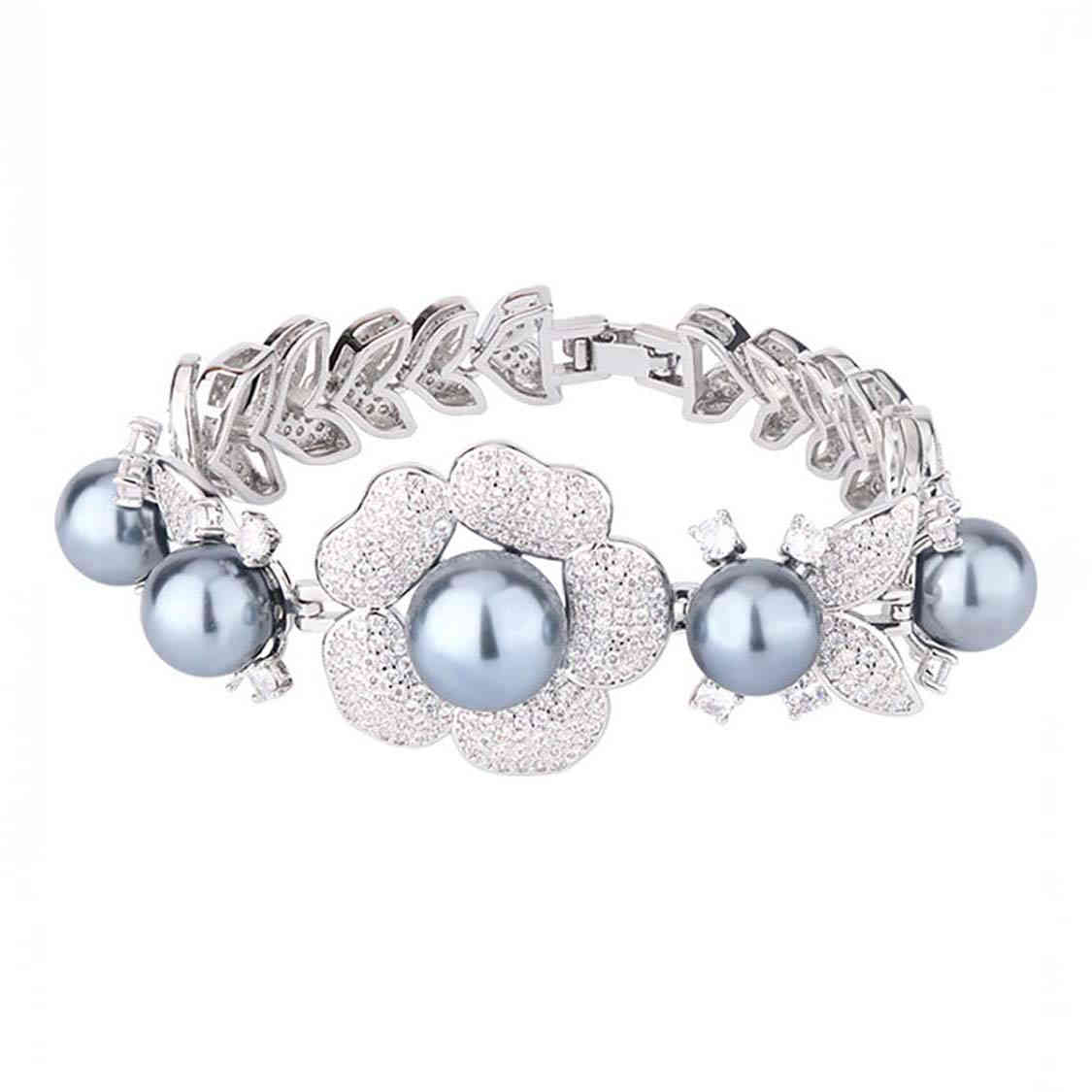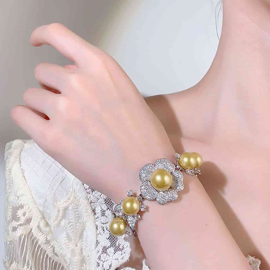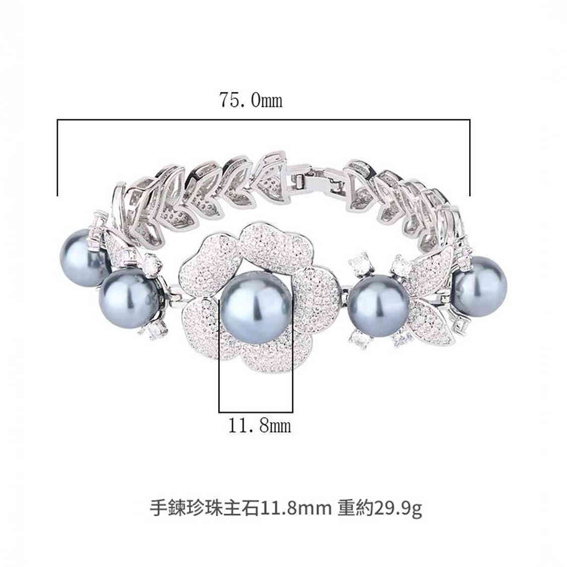 珍珠提供柔和高雅的光澤,花瓣與葉片密鑲鋯石,折射出鑽石般的細碎火彩。手鏈共有珍珠白、霧灰與香檳金三種顏色可選:白色經典百搭、灰色高貴冷調、黃色華麗吸睛,無論是婚宴禮服、宴會長裙或旗袍,都能找到與之相配的一款。