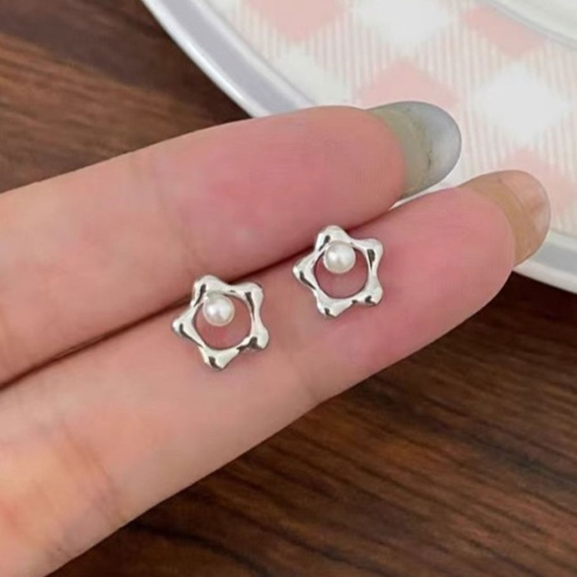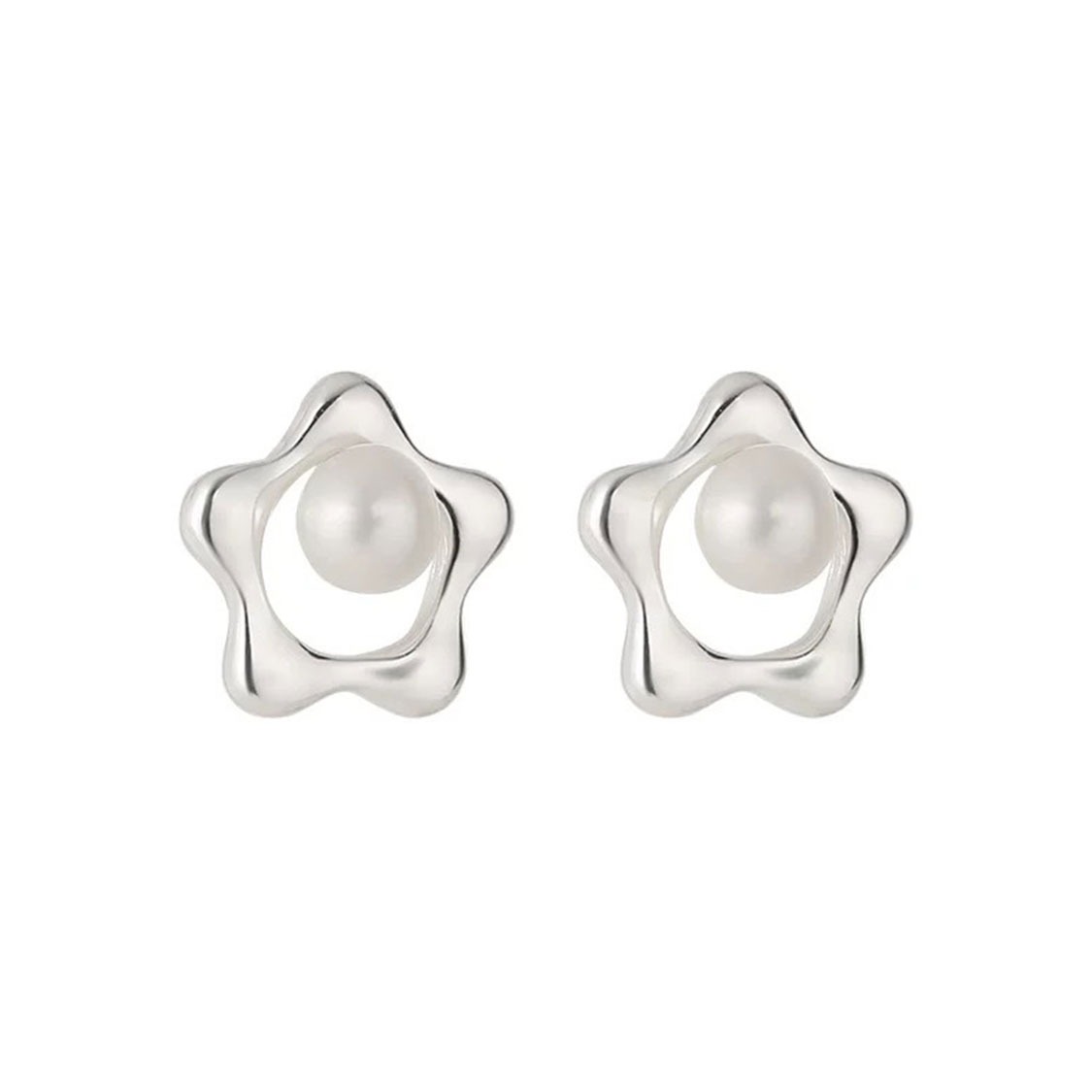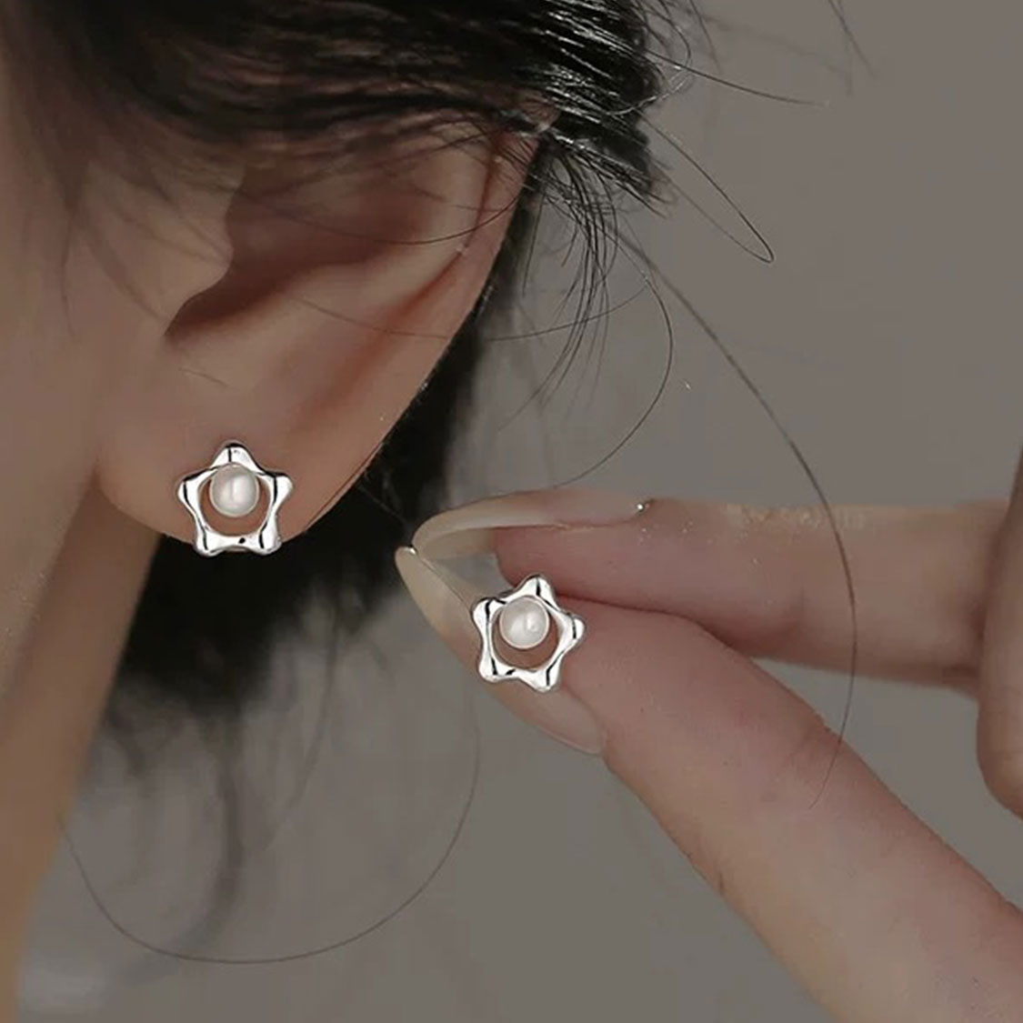 星形外框採用925銀製作,線條圓潤不生硬,光面拋光後反射細緻光澤,既可愛又帶一點法式慵懶感。中間的珍珠帶有自然柔和的光暈,不會過於高調,卻能悄悄修飾膚色,讓臉部輪廓看起來更精緻;無論是襯衫通勤、針織毛衣約會,或是簡單T恤,都能輕鬆搭配。