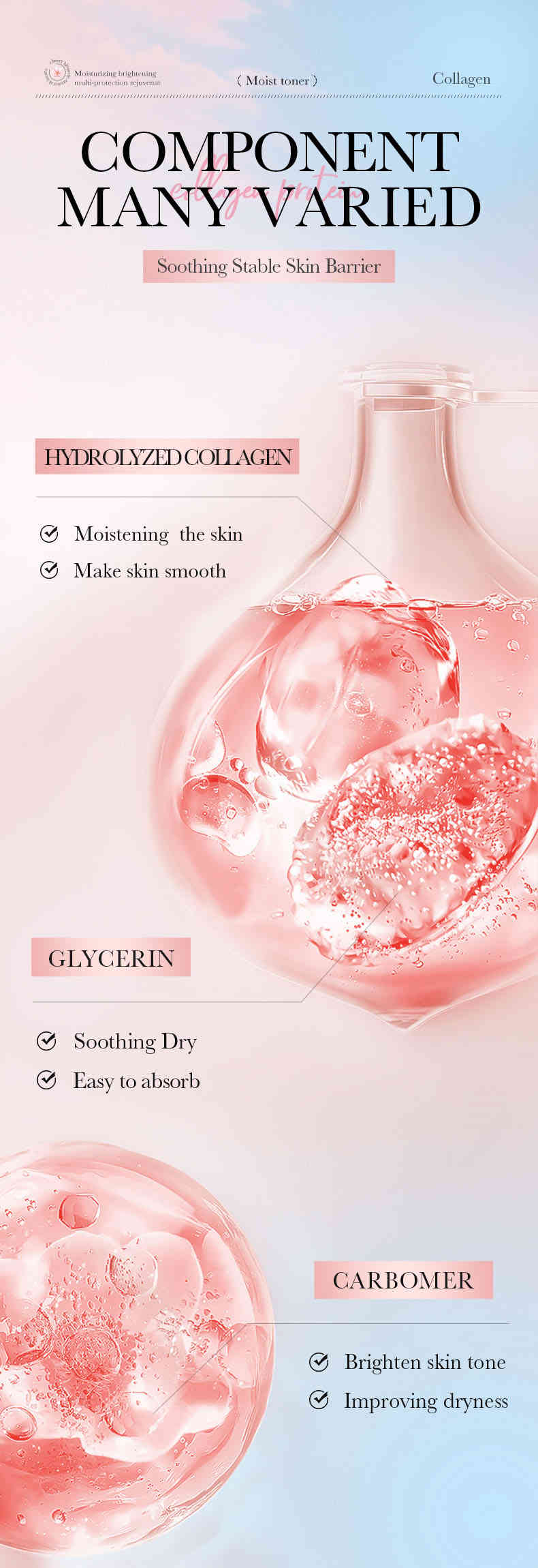 溫和植萃成分:甘油、碳聚合物等,溫和調理,適合所有膚質,尤其乾燥與暗沉肌。