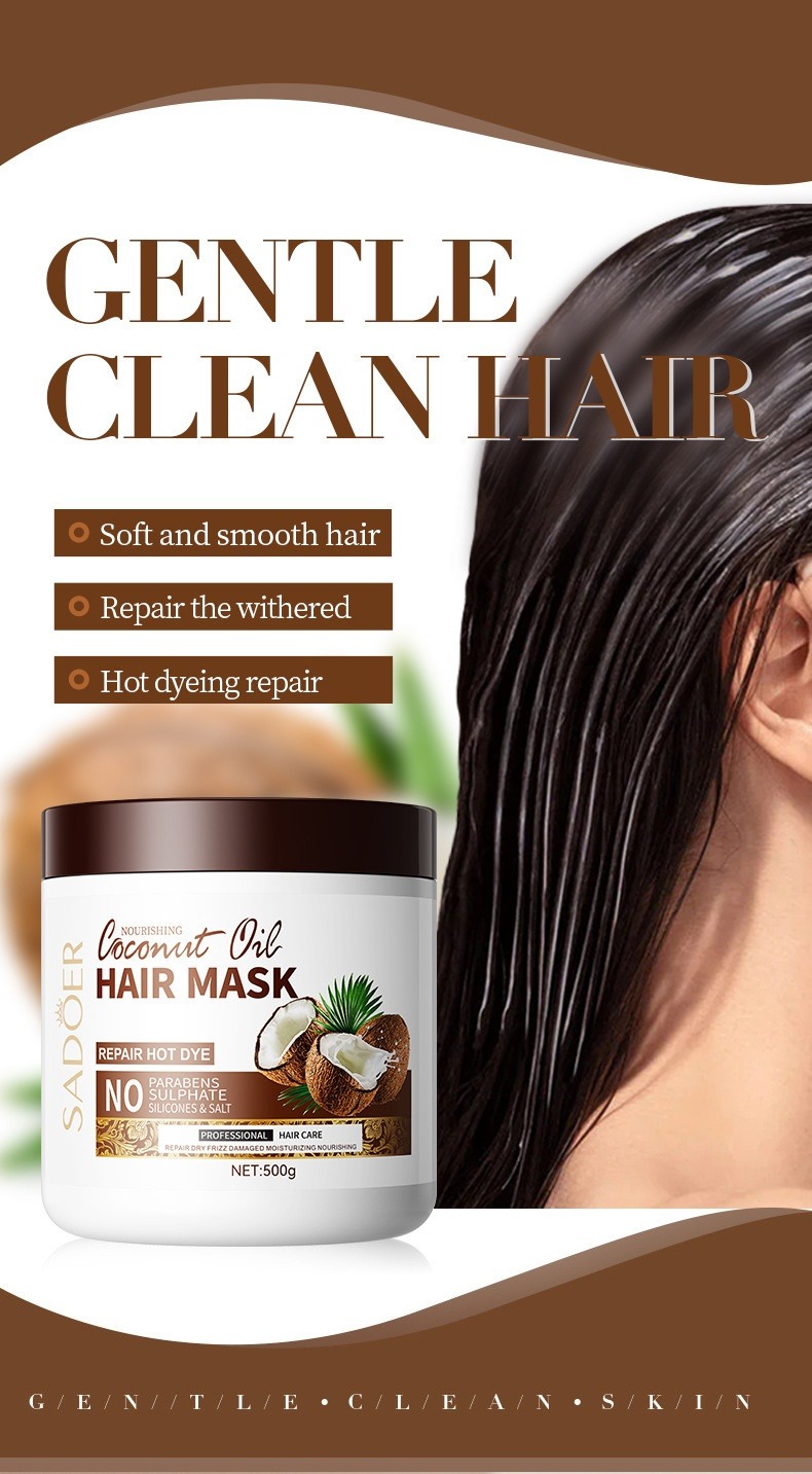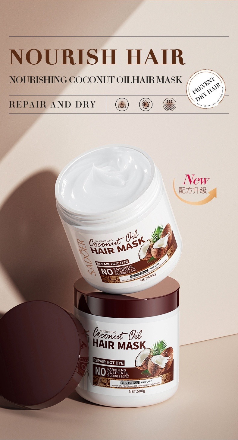 SADOER 滋養椰子油修護髮膜,富含天然椰子油精華,專為熱損、染燙、日常受損髮絲提供密集修護,深層滋養、重建髮絲強韌與光澤。