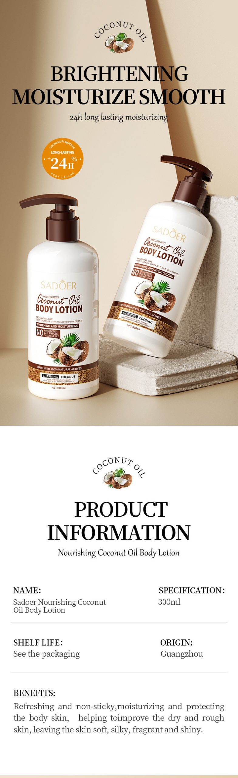 SADOER 滋養椰子油身體乳,嚴選100%天然活性椰子油精華,質地清爽不黏膩,能深層保濕、改善乾燥粗糙,使肌膚24小時持續柔嫩透亮。