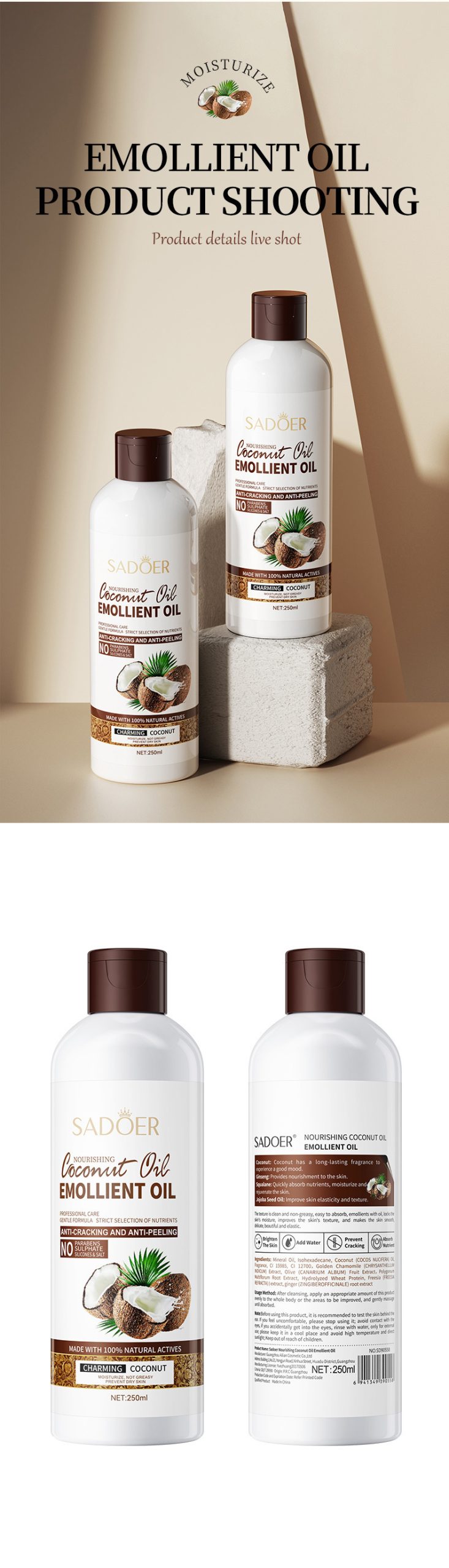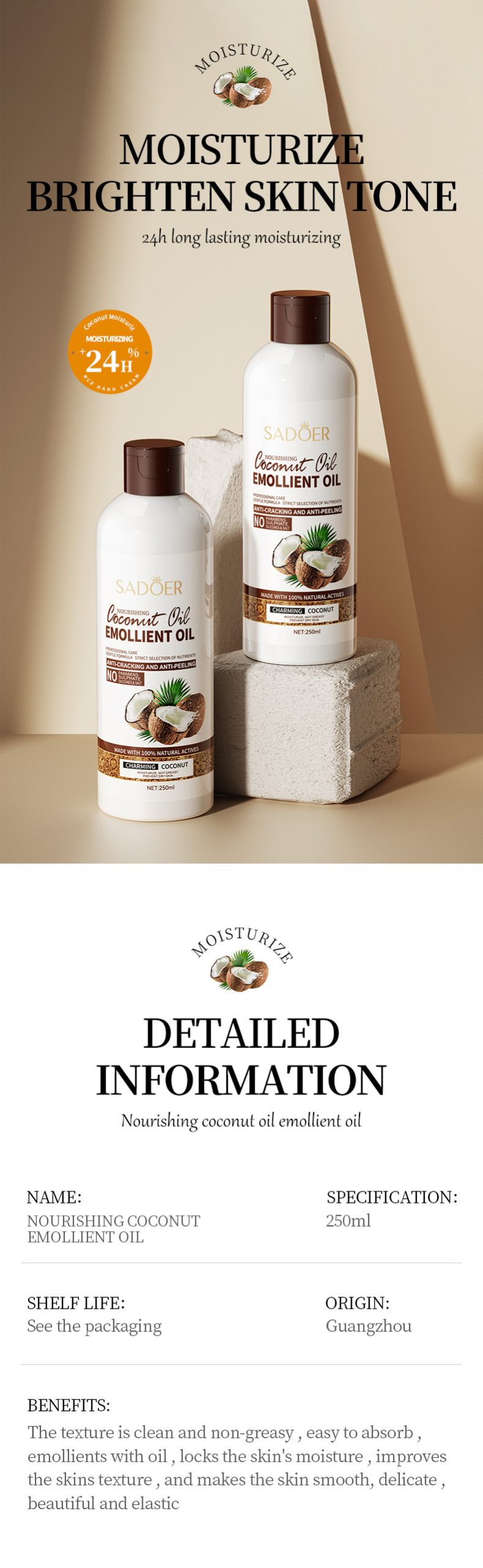 SADOER 滋養椰子潤膚油,嚴選天然椰子油為基底,結合專業護膚配方,質地清爽不油膩,深層滋潤、改善粗糙,讓肌膚重現細膩彈潤光澤。