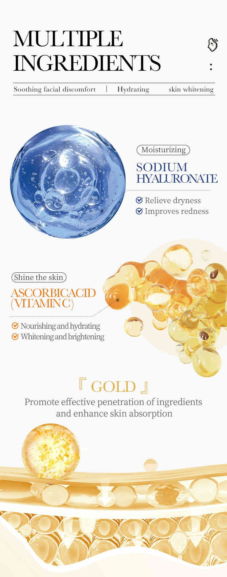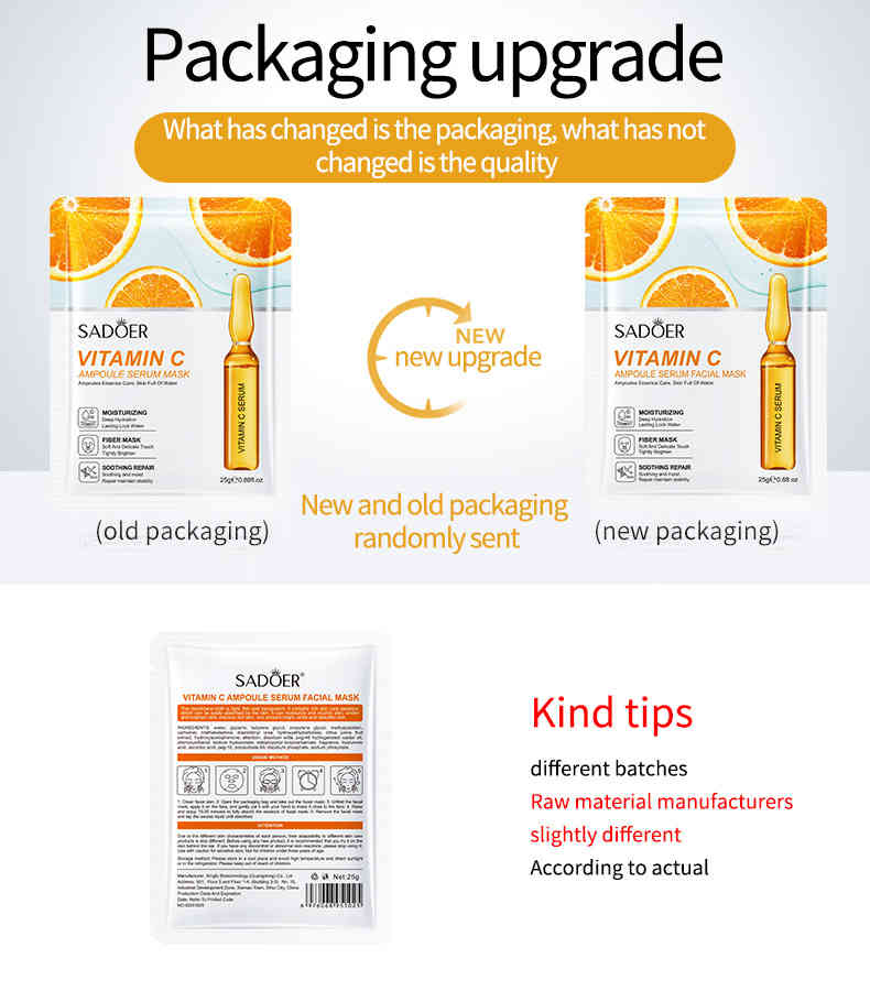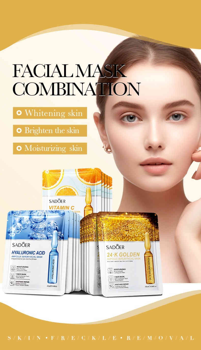 SADOER 玻尿酸維他命C精華面膜專為肌膚補水、亮白與舒緩設計,每片蘊含25g豐富精華液,結合玻尿酸與維他命C雙重活性成分,深層滲透肌底,提供持久保濕與修護效果。面膜採用天然植物纖維膜布,輕薄柔軟且貼合面部,能有效鎖住精華,促進吸收。適合各種膚質,尤其適合乾燥、暗沉或需要舒緩的肌膚使用。