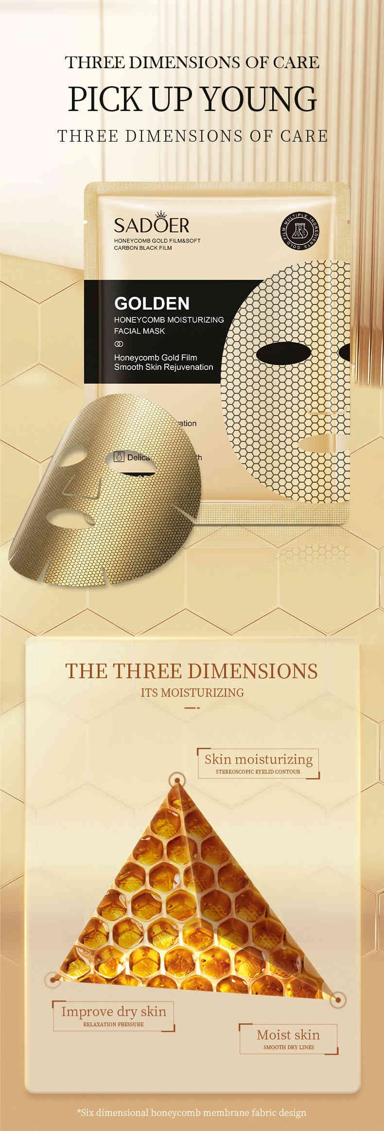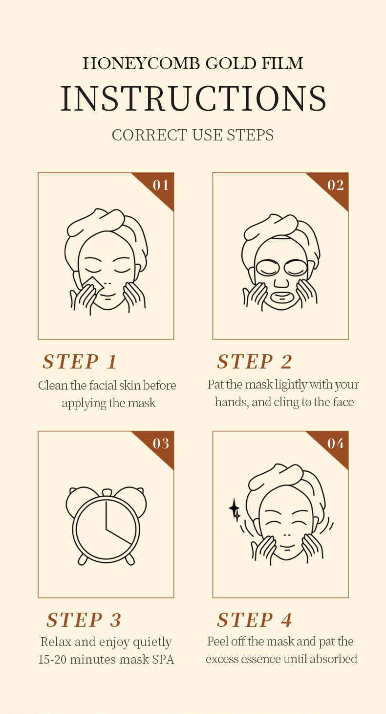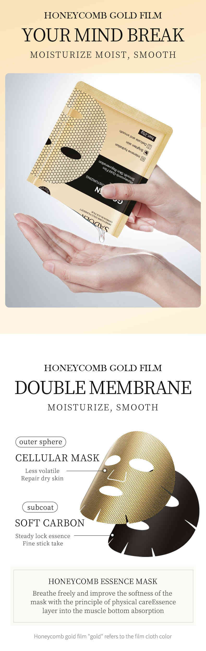 黃金蜂窩雙膜設計:蜂窩金膜 + 軟碳黑膜,雙層鎖住精華,貼合肌膚,自由呼吸不悶膩。