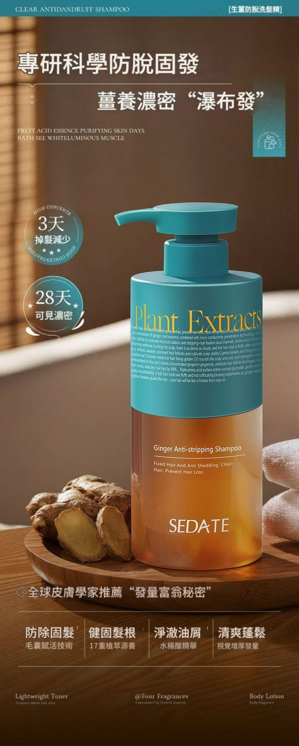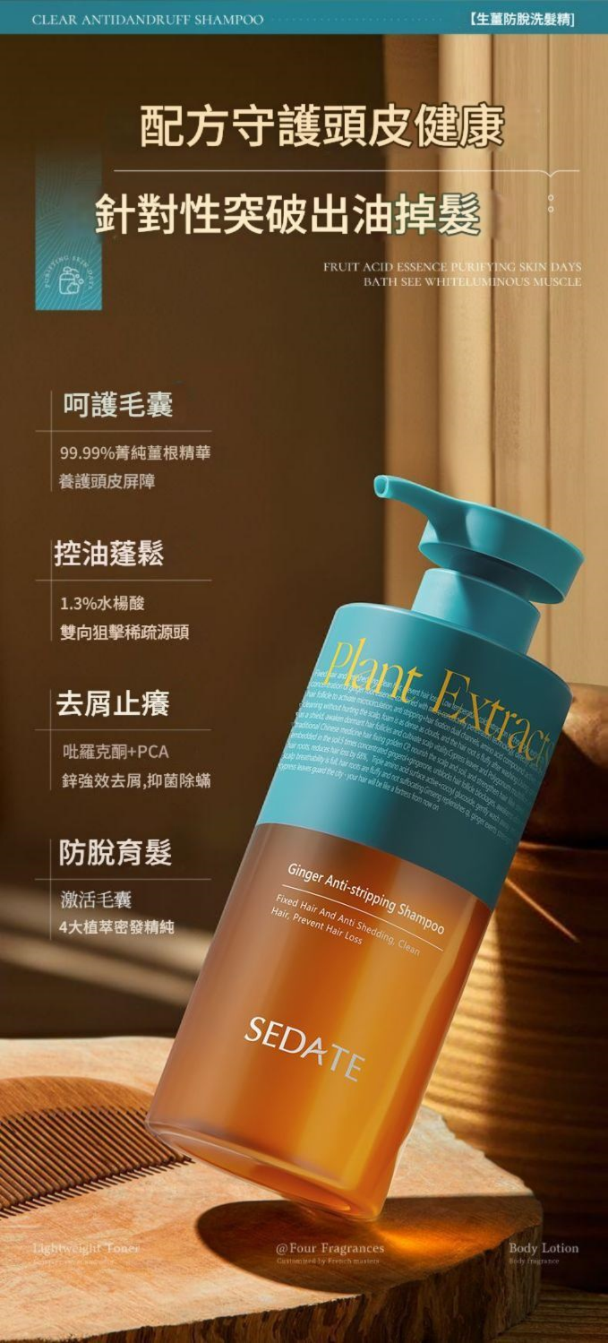 SEDATE 防脫育髮洗髮精,針對亞洲人頭皮特質與常見掉髮成因(如熬夜、壓力、產後、出油過多等)專研配方。融合 日本黑薑黃、人參、當歸、何首烏等 8重植萃精華,從根源強健髮根、激活毛囊,幫助你重拾豐盈髮量。