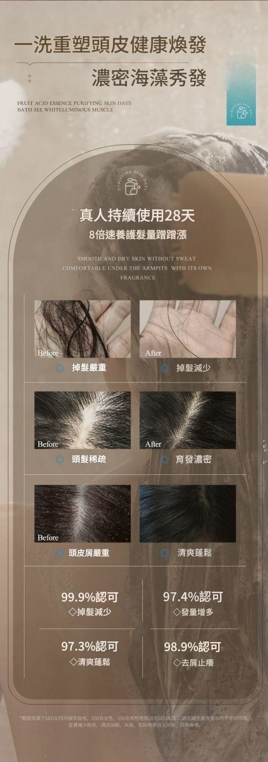 使用 3天 掉髮明顯減少,持續使用 28天 可見髮量豐盈、頭皮健康提升。