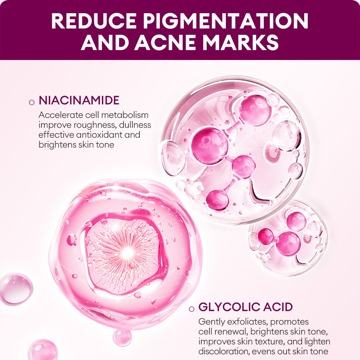 黃金配比「甘醇酸 + 維他命B3」:溫和代謝老廢角質,加速黑色素分解,有效淡化痘印、斑點,提亮整體膚色。