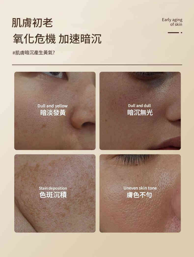 富含菸鹼胺與植萃成分,禦氧減黃,改善膚色不勻,重現飽滿光澤。