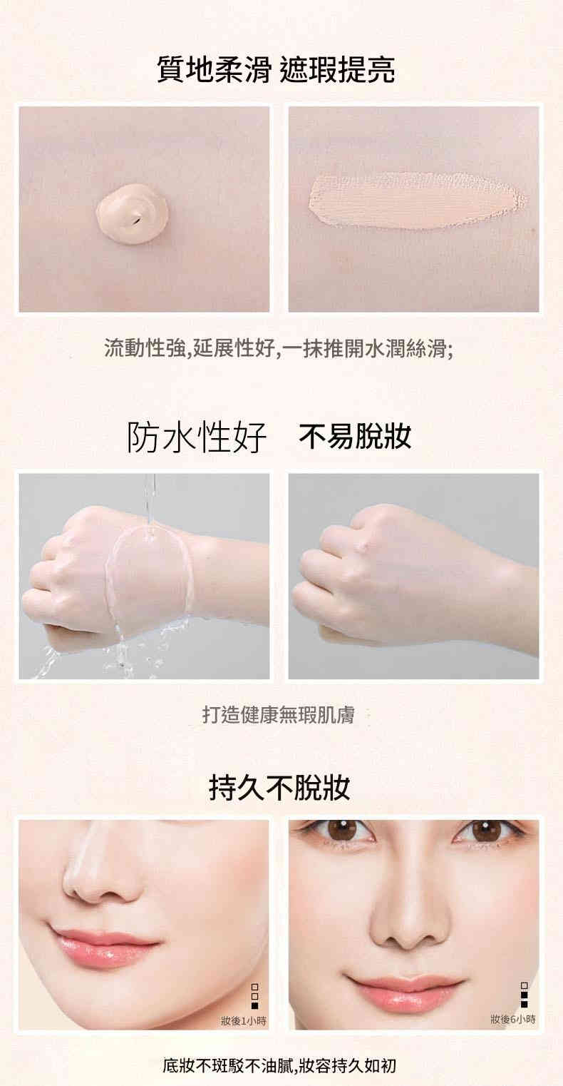 質地水潤延展性好,能緊密貼合肌膚,不易因出汗出油而斑駁脫妝,全日保持妝容清爽乾淨。